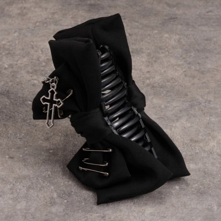 Gothic Pins Decorated Black Bow Claw Clip with Cross Chain