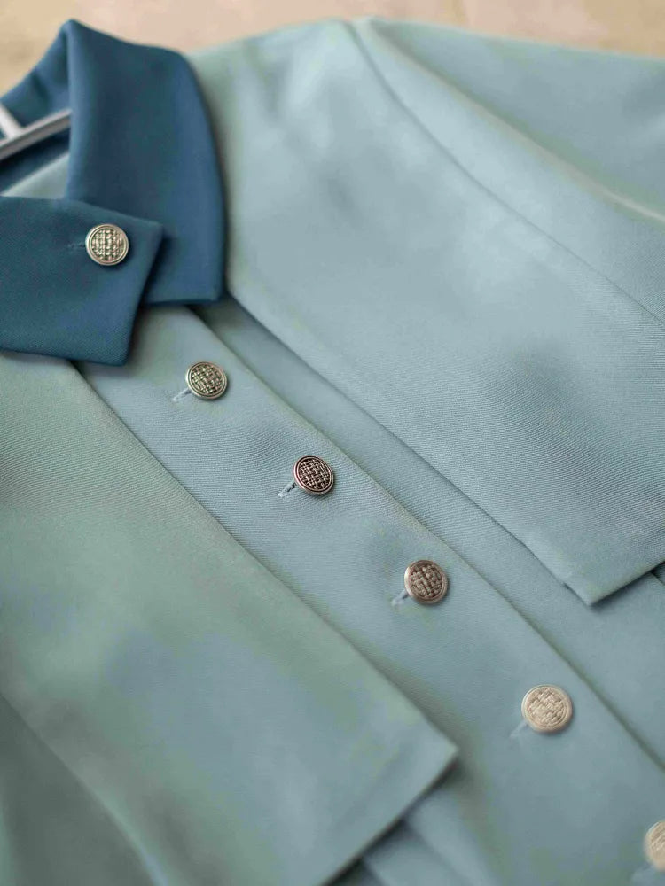 ボーバトンのユニフォーム風ダスティブルーのエレガントなヴィンテージドレス、フロントボタンプラケット、取り外し可能なケープ付き