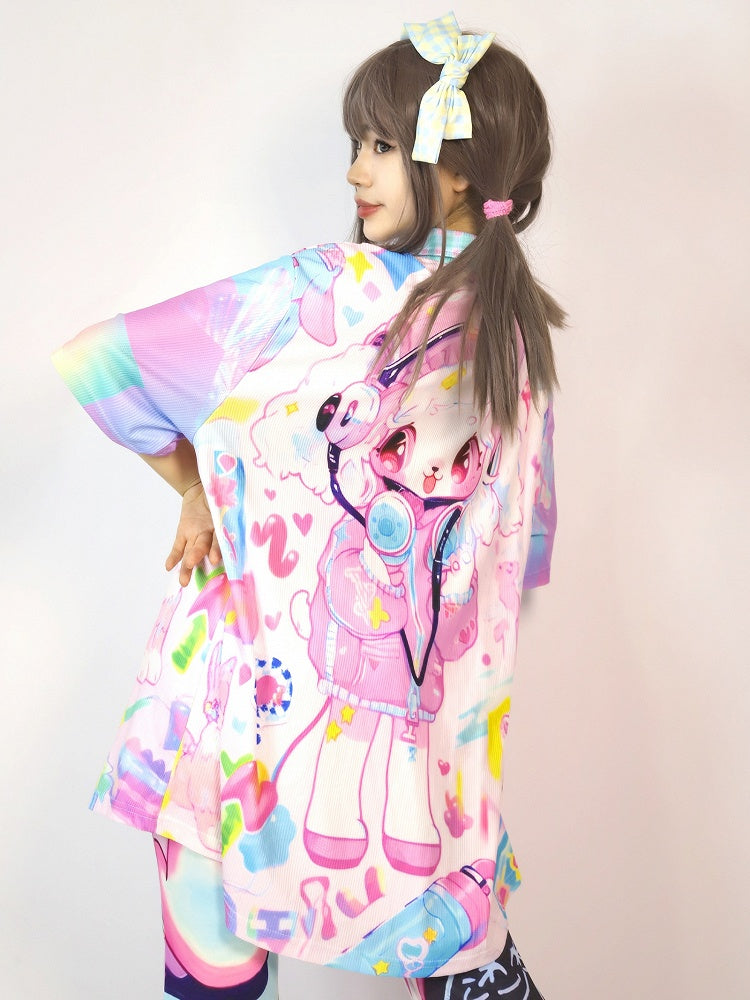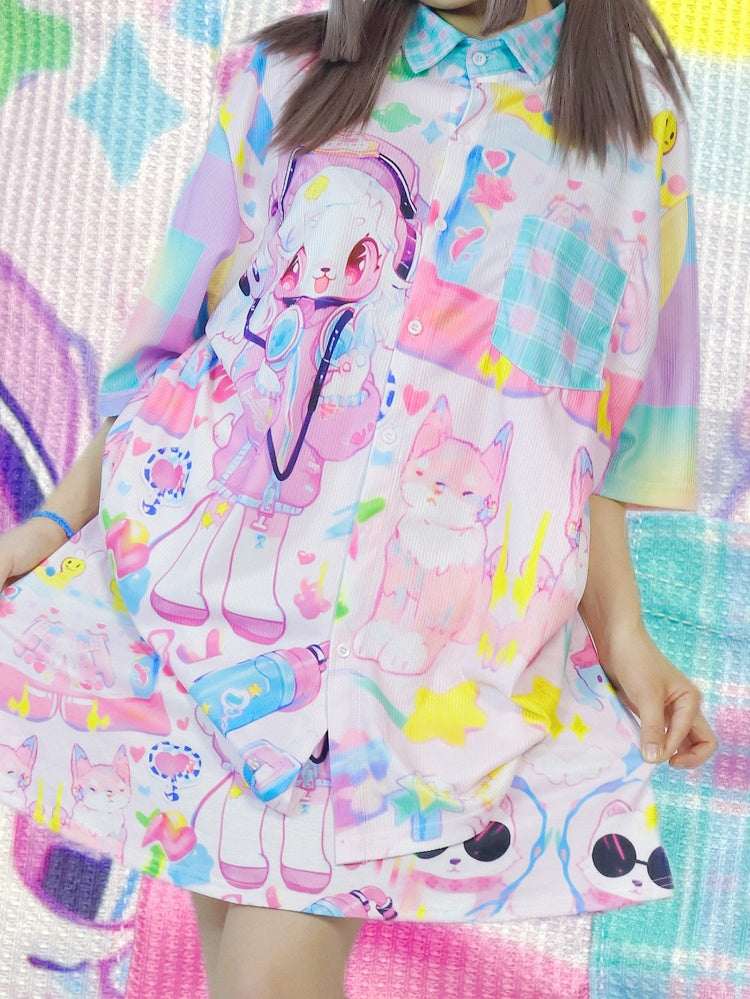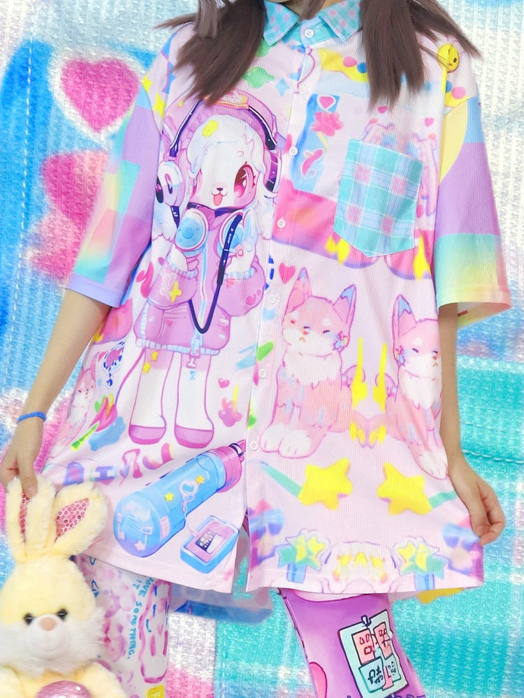 Light Blue Cartoon Print Plaid Pattern Shirt