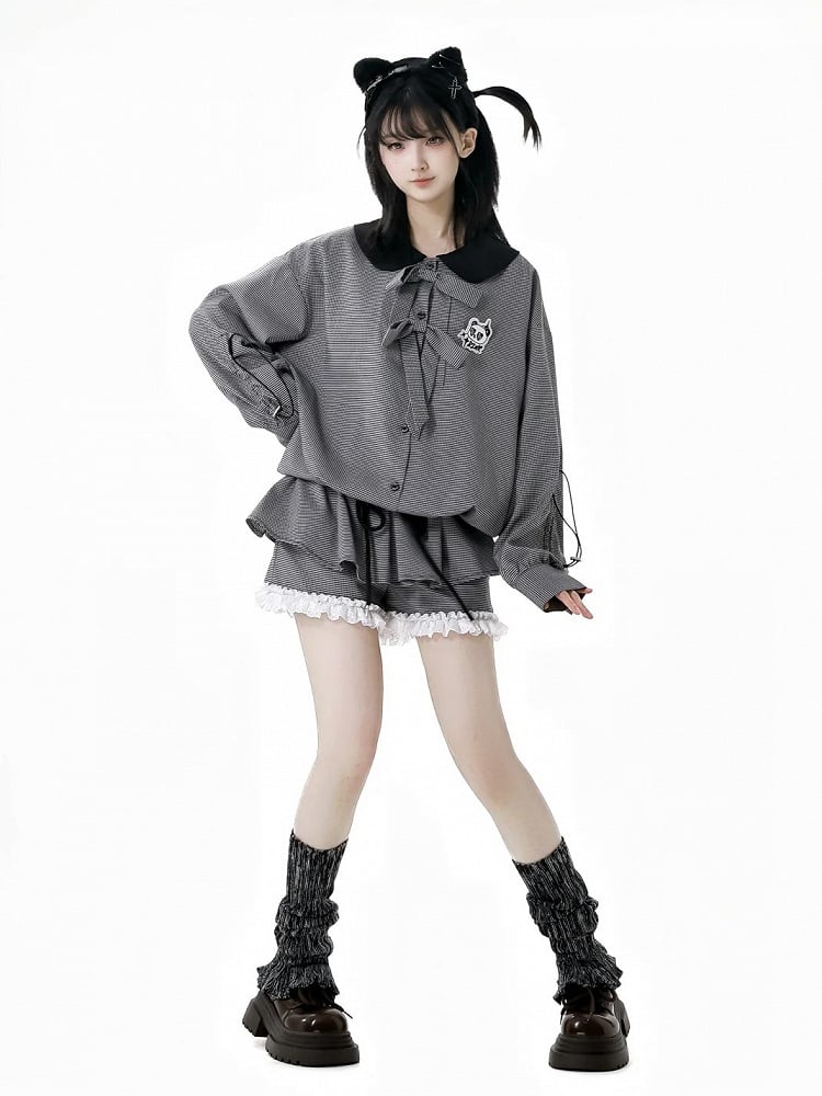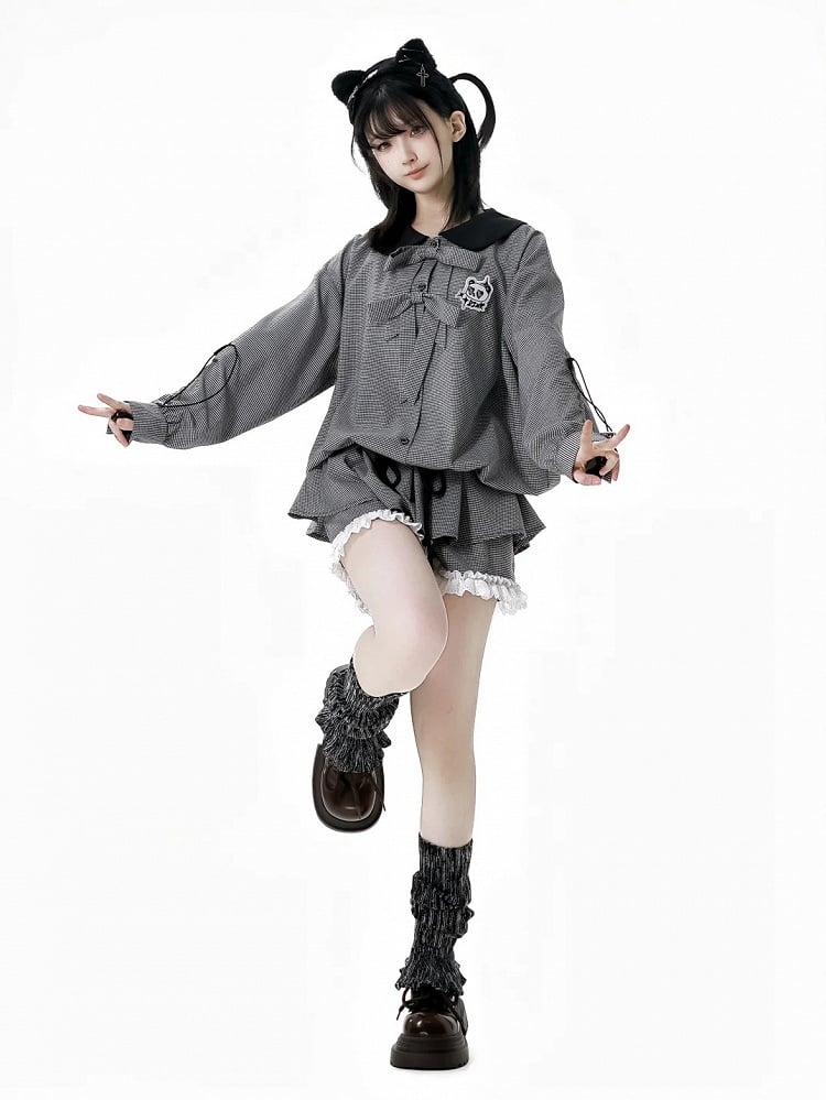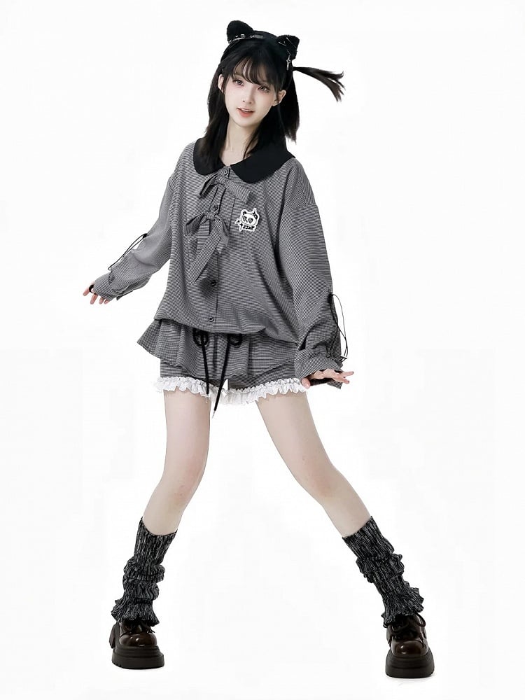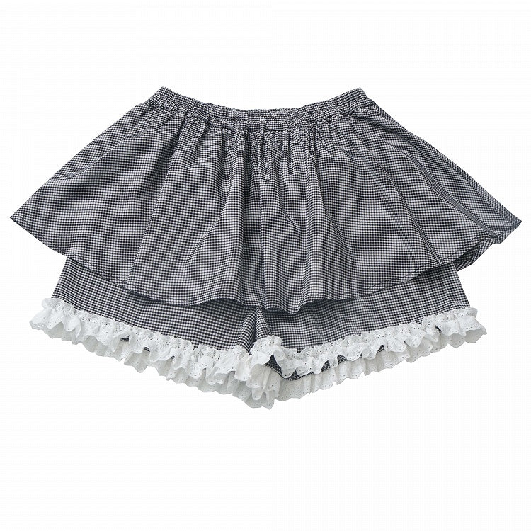 チェック柄の伸縮性ウエスト、フリルレーストリムのスコートとホワイトブラック