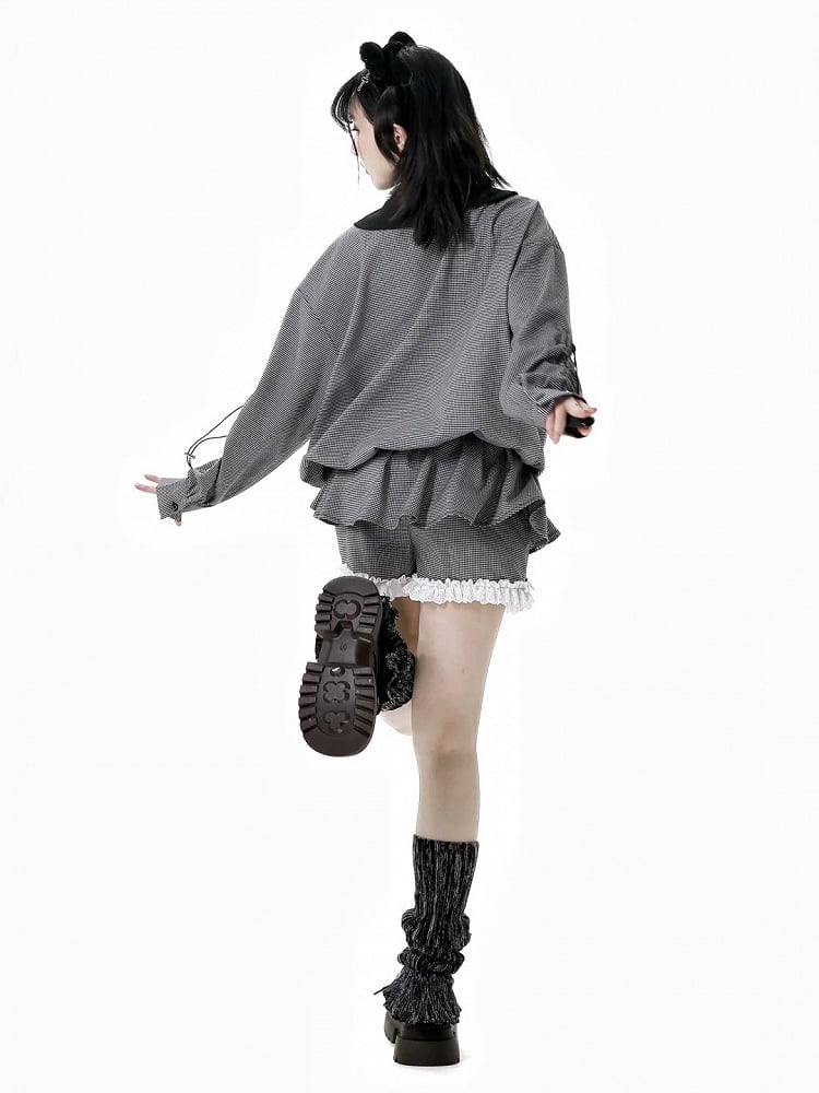 チェック柄のゴムウエストとフリルレーストリムがスタイリッシュなスコートは、スタイリッシュで機能的です。伸縮性のあるウエストバンドが快適なフィット感を提供し、フリルレーストリムが可愛らしさをプラス。どんなシーンにもぴったりなこのスコートは、ワードローブに欠かせないアイテムです。