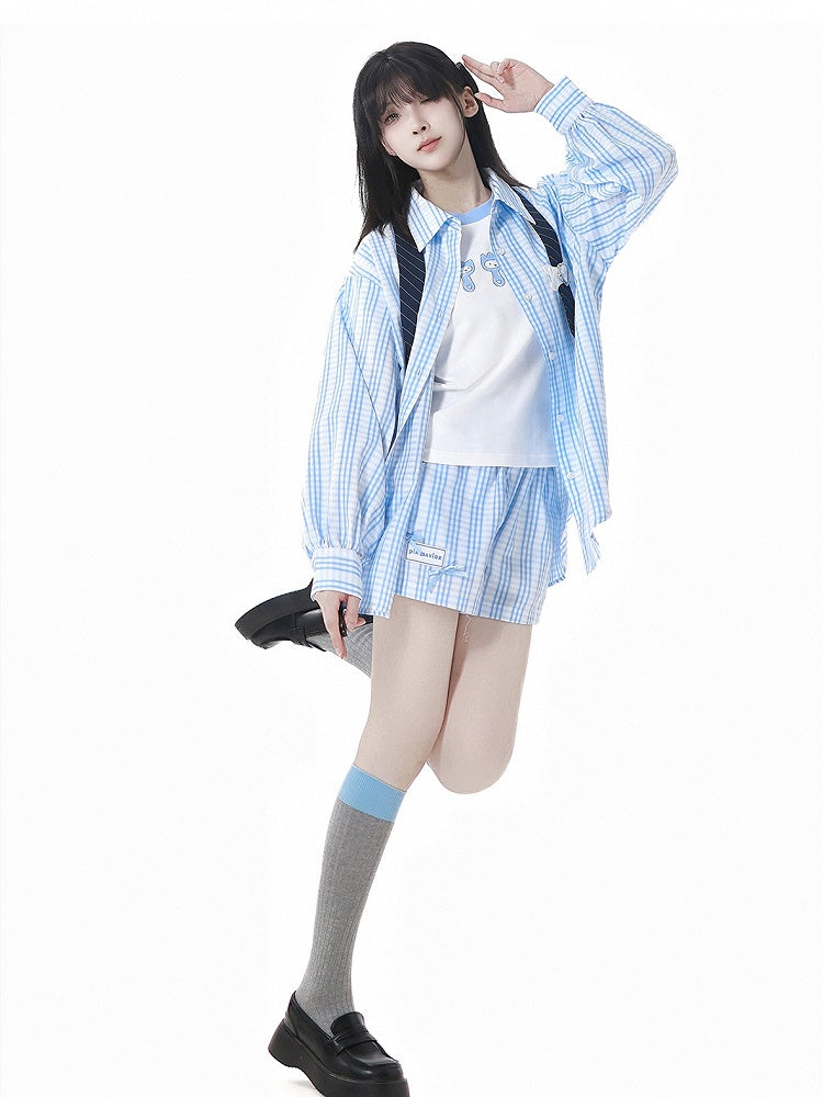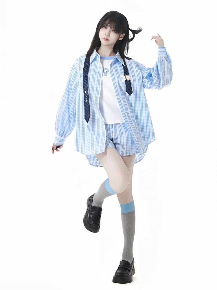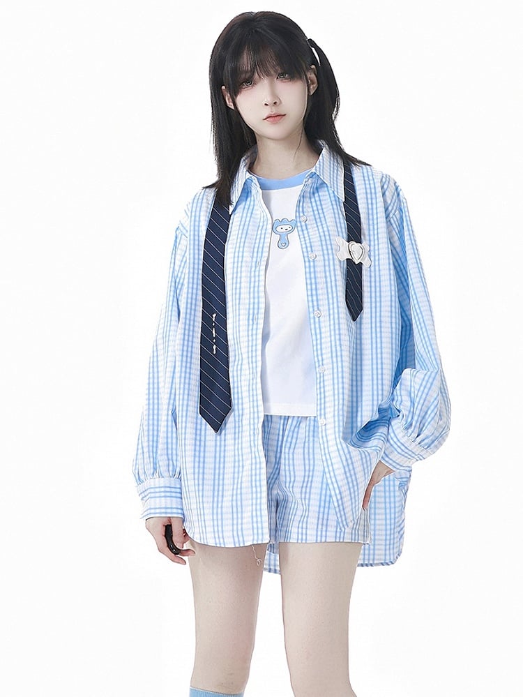 ブルーとホワイトのネクタイデザインのゆったりとしたチェックシャツ