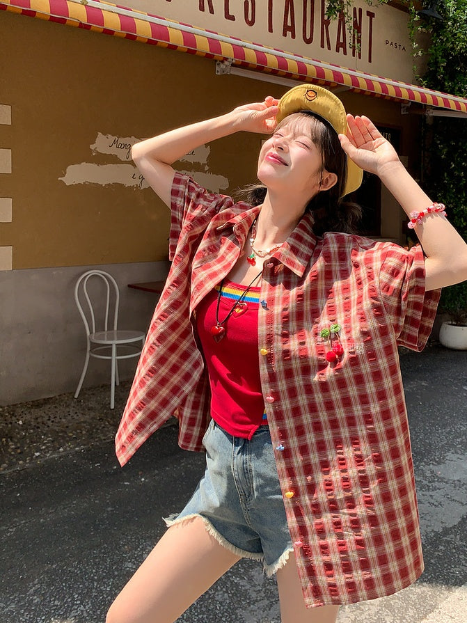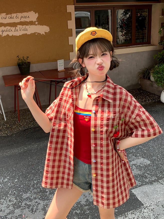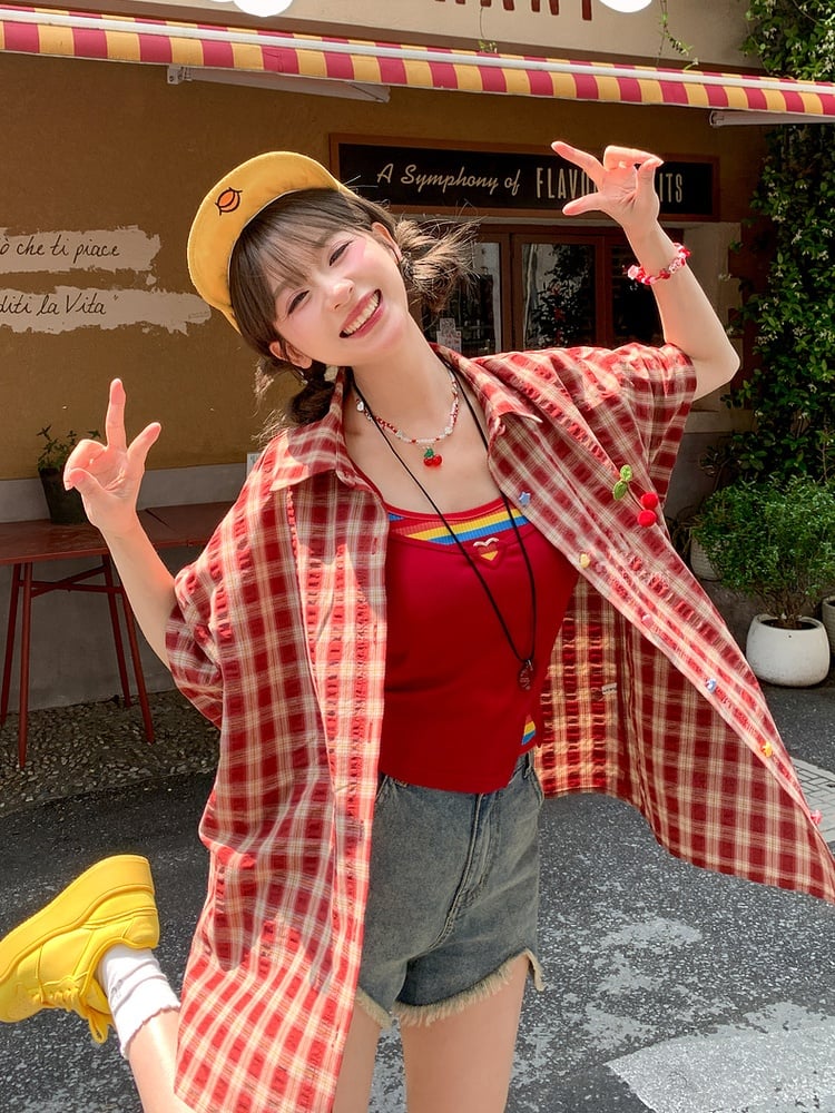 チェックシャツセット レッドフェイクツーピースキャミソールトップ(レッド)