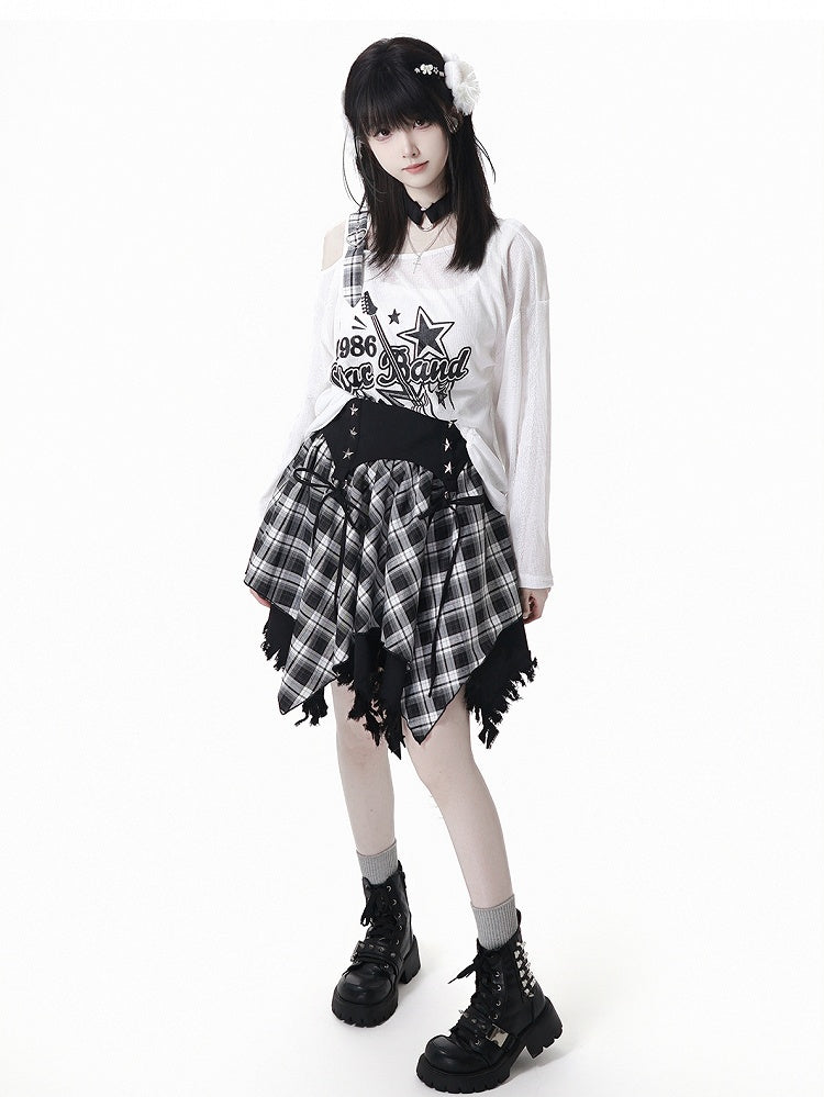 ほつれたハンカチ裾のブルー&ホワイト/ブラック&ホワイトのチェック柄スカート