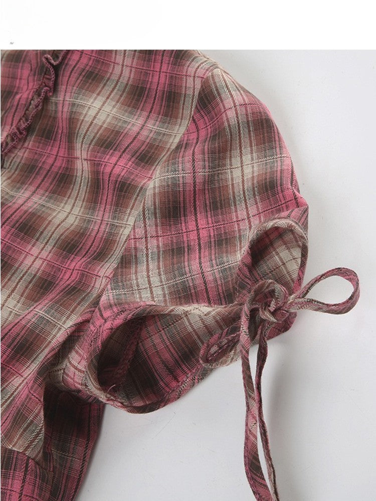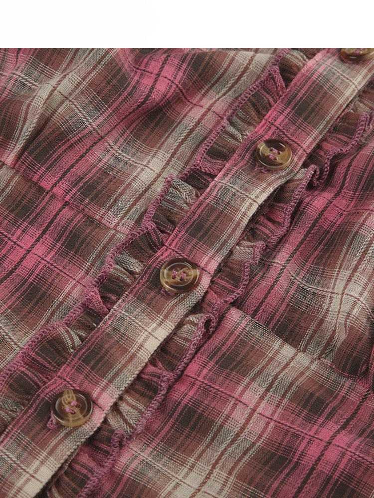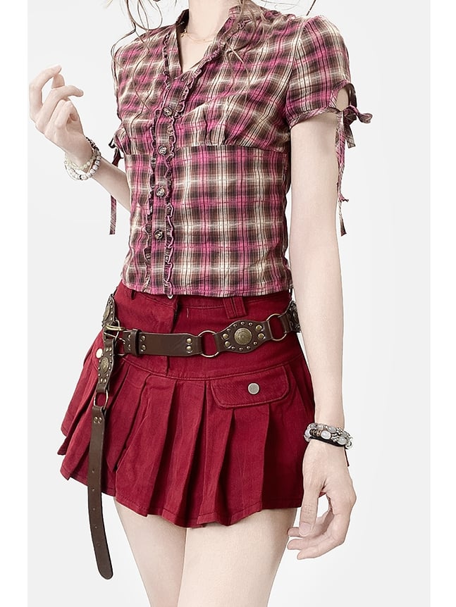 チェック柄袖フリルトリム柄シャツ Vネック Y2K ショートパンツ レッドブラウン