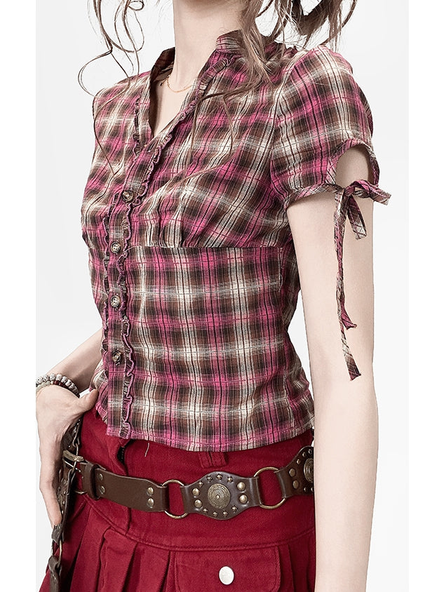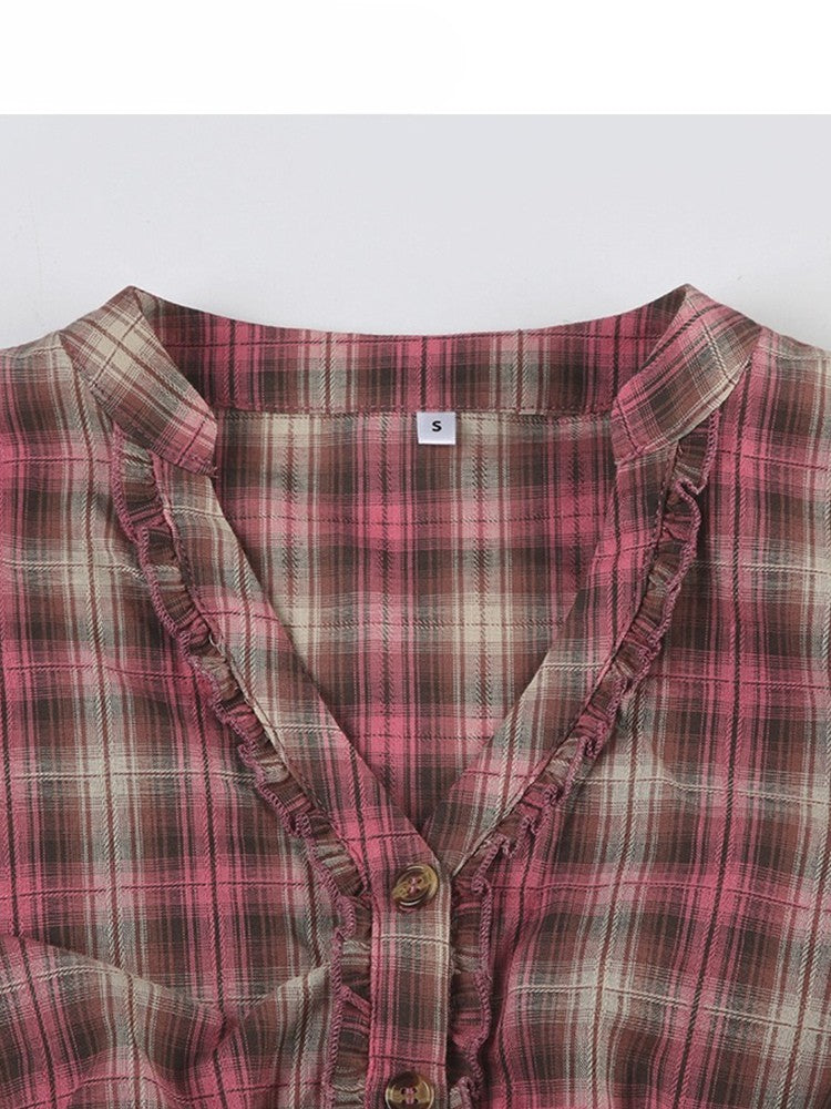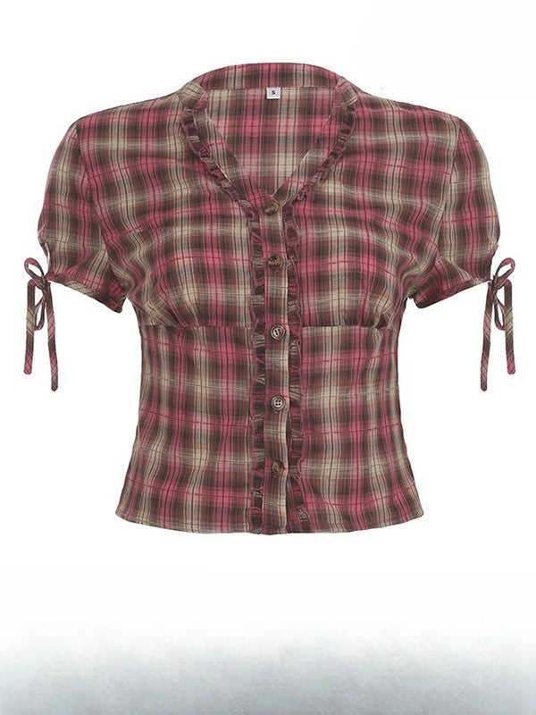 レッド&ブラウン Y2K チェック柄 フリルトリム Vネック 半袖シャツ