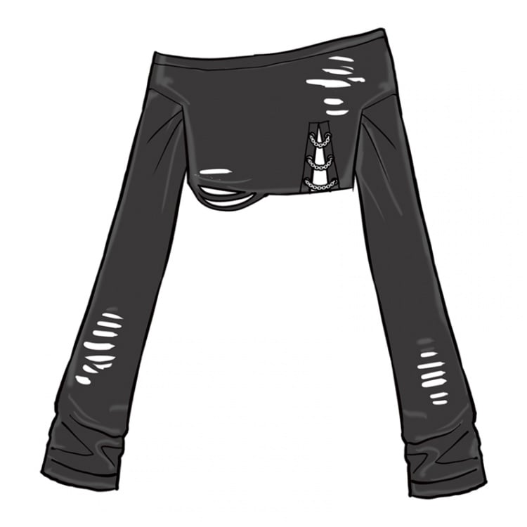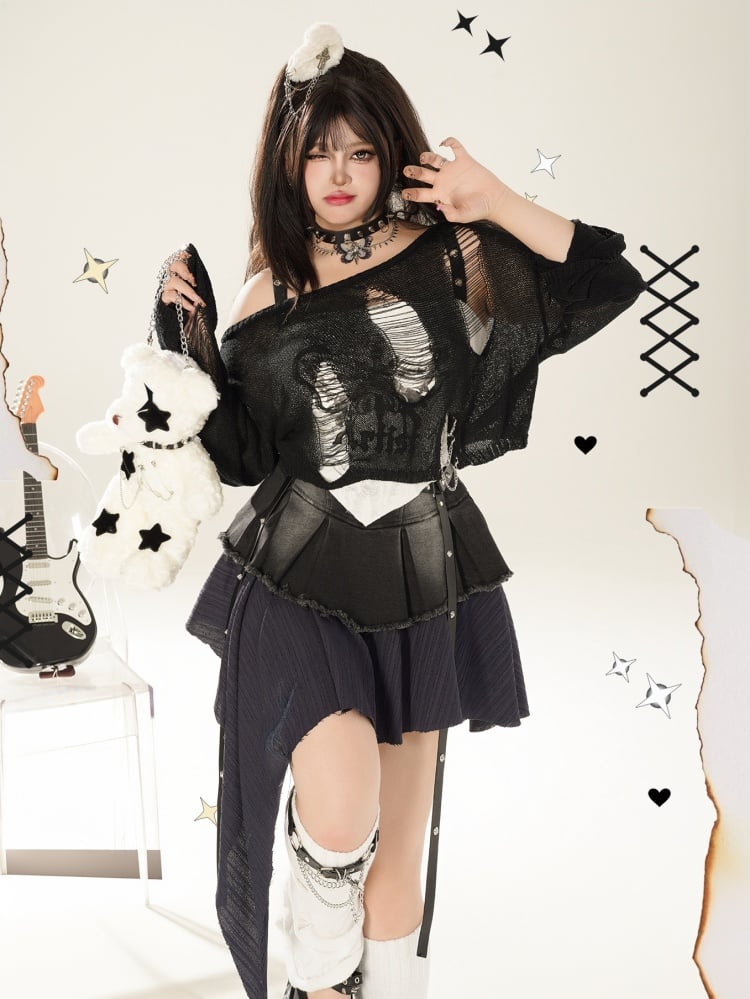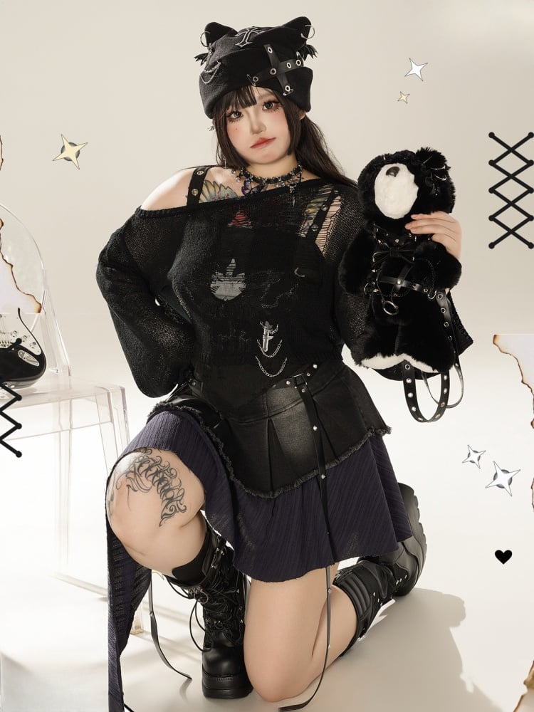プラスサイズ ブラック ダメージ加工 ホールズ ニット トップス チェーン付き