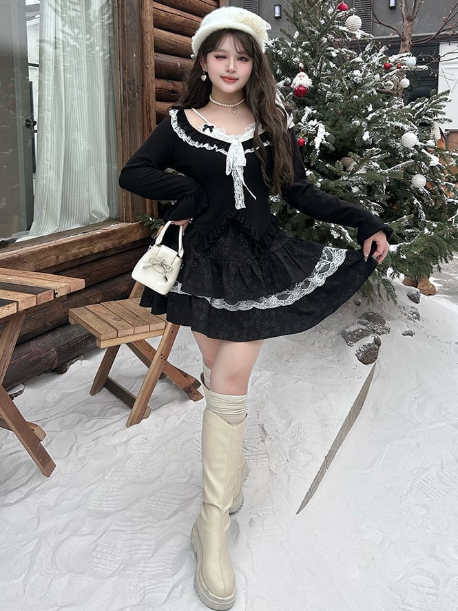 プラスサイズ ブラック レースアクセント フローラルジャカード ティアードスカート