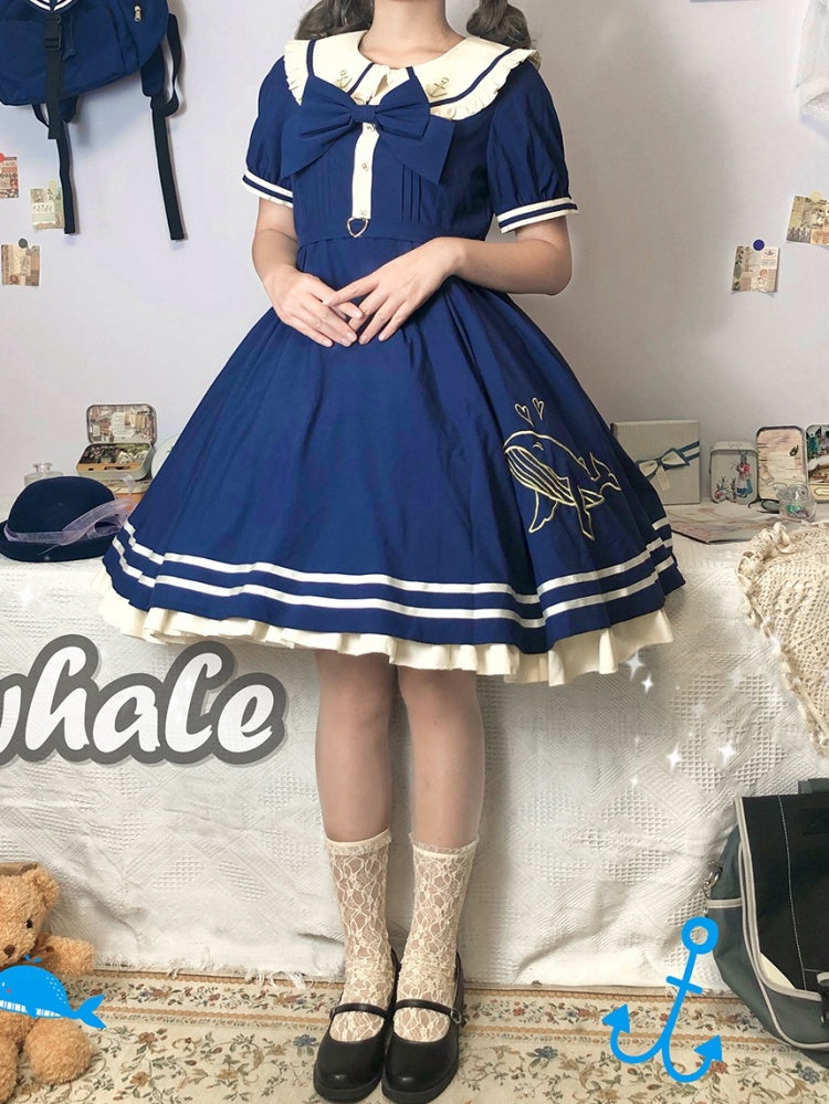 プラスサイズ対応ダークブルーのスイートドレス、ホエールピーターパンカラー