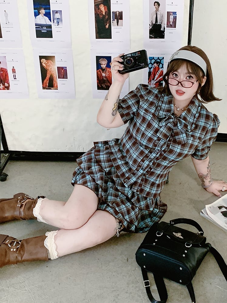 Plus Size Tiered Blue and Brown Plaid Blouse Preppy Style Sleeves Short Skirt /