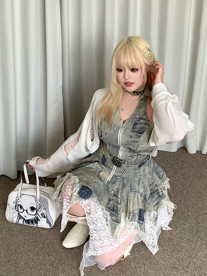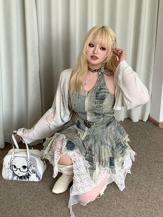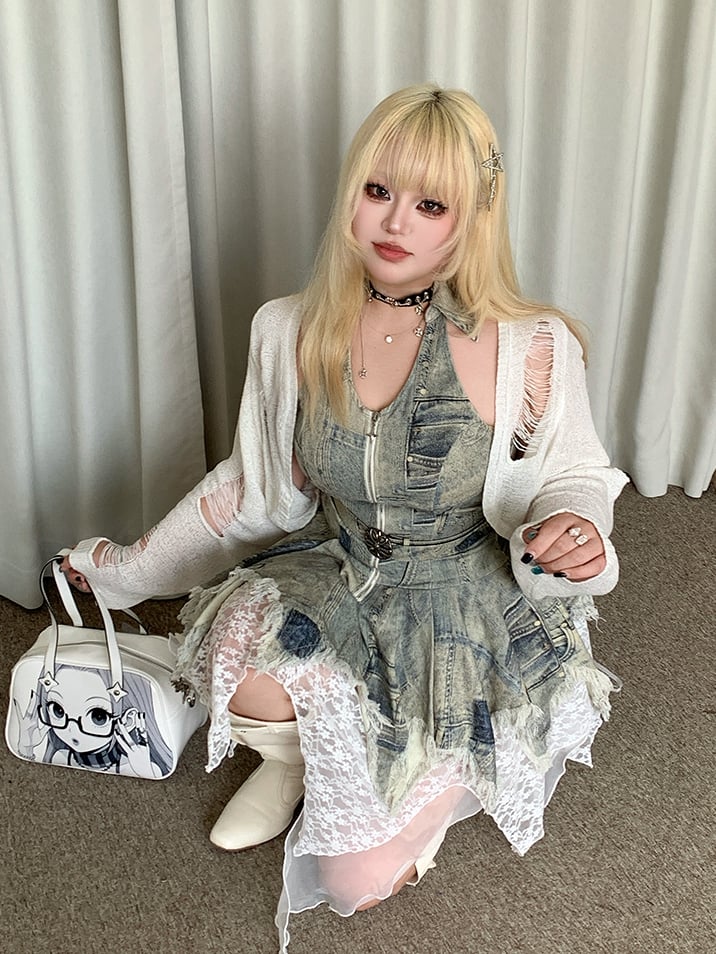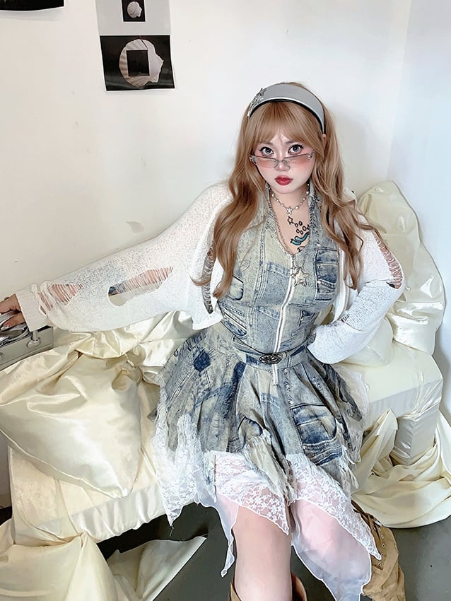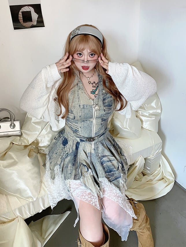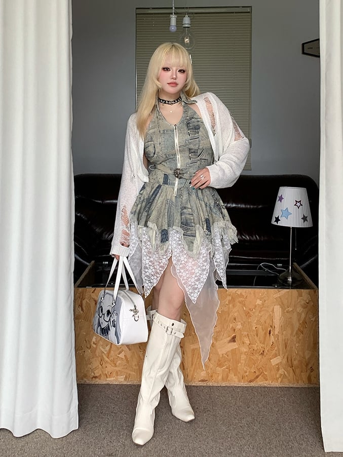 青と白のオールドスクールロリータファッションドレス 蝶結びディテール JSK セット