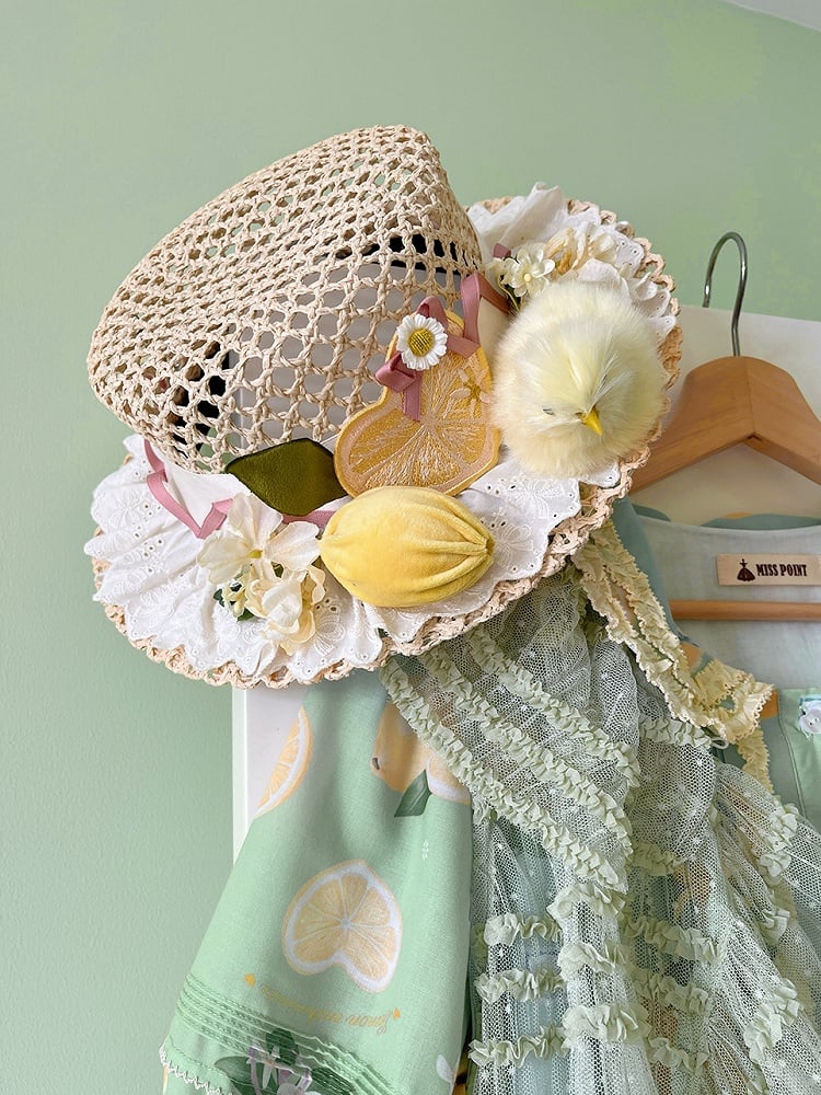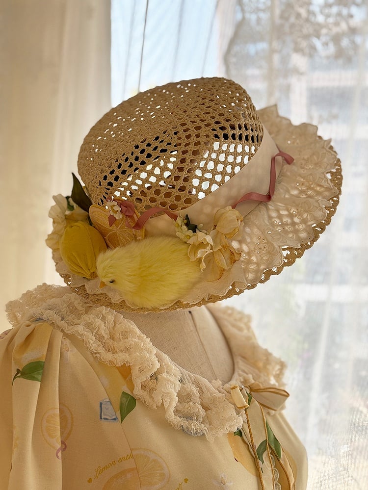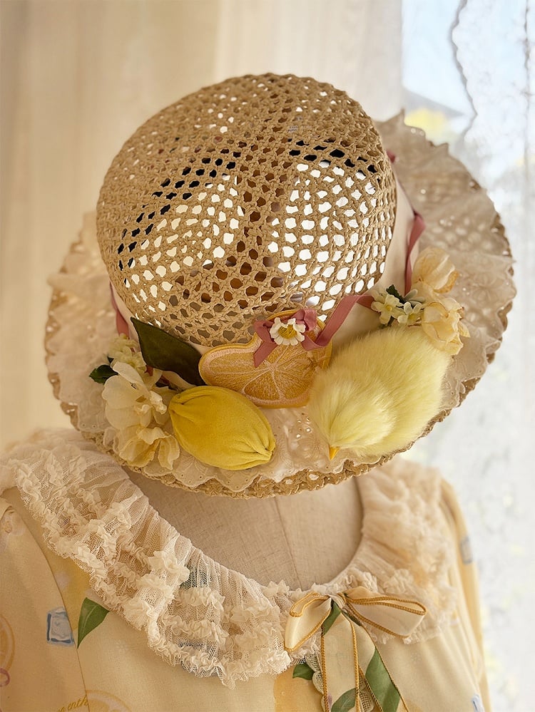 ぬいぐるみのひよこと花で飾られた麦わら帽子をくり抜く