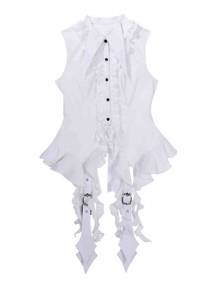 尖ったフリルの裾、カスケーディングトリム、ホワイトシャツ、ノースリーブカラー