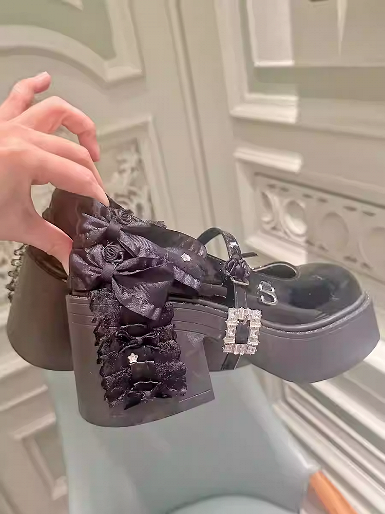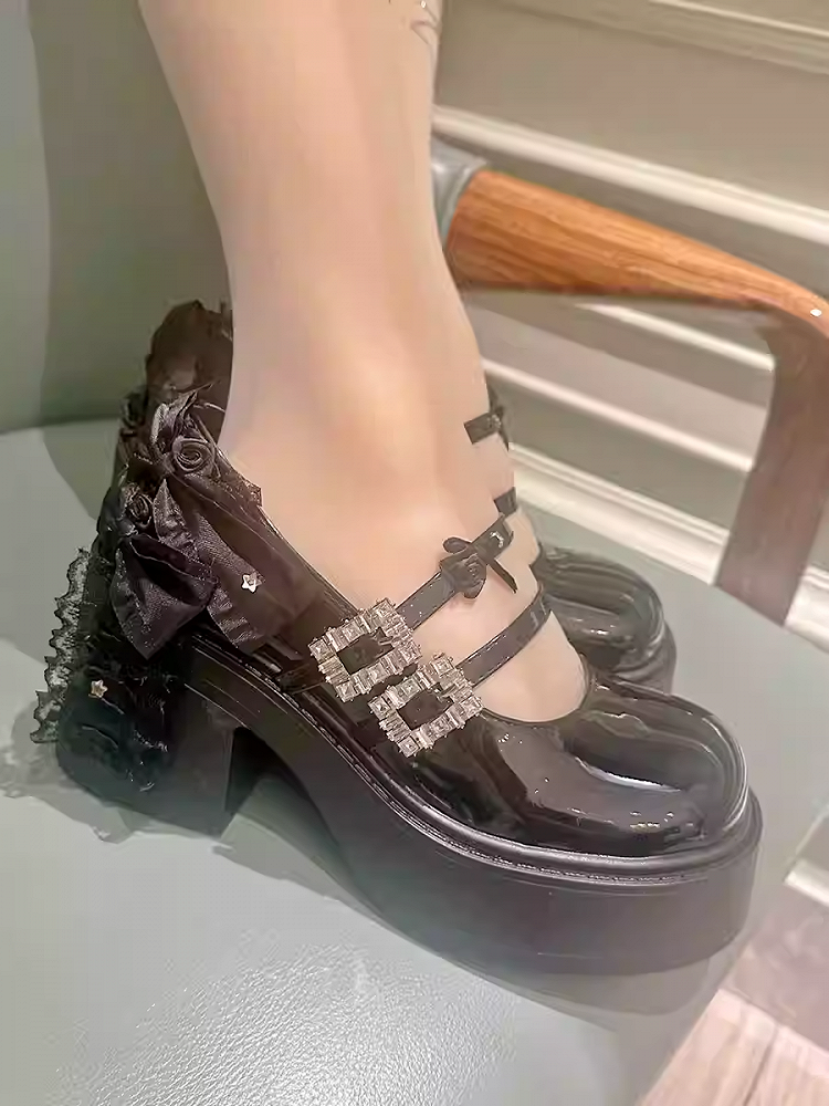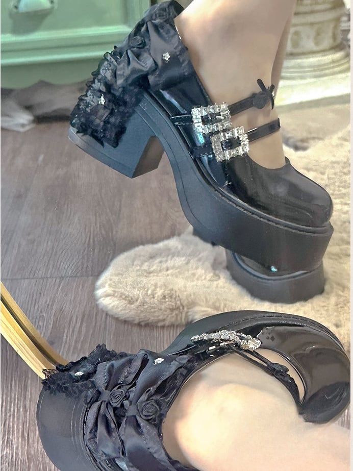 光沢のあるブラックのラインストーンバックルボウとフローラルブロックヒールのメリージェーン
