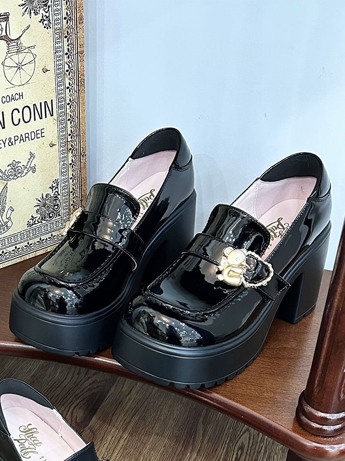 光沢のあるブラックのハグベアハートバックルプラットフォームハイブロックヒールスリッポン