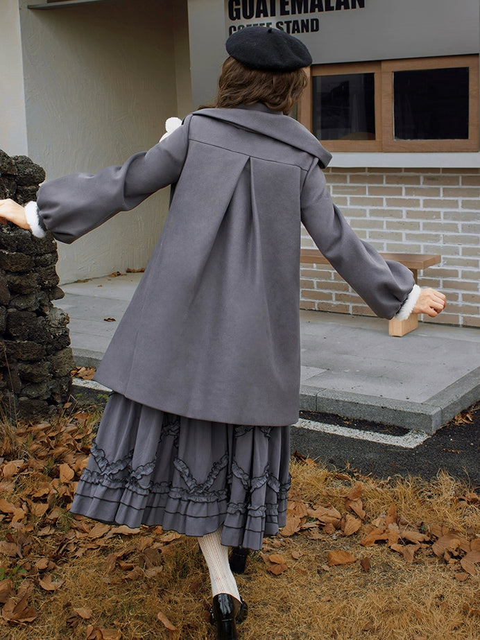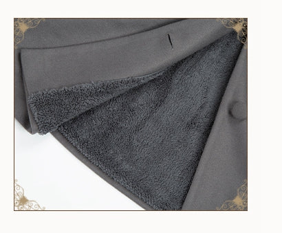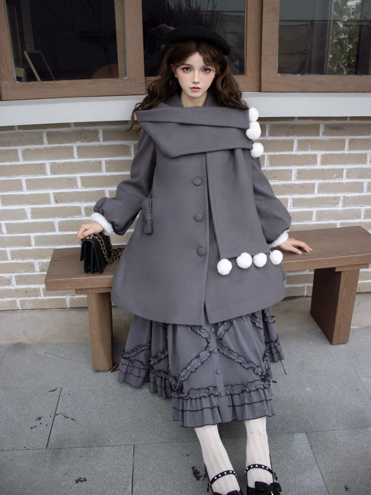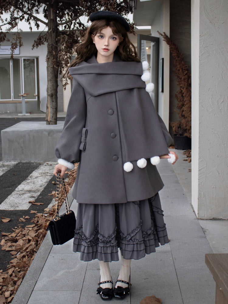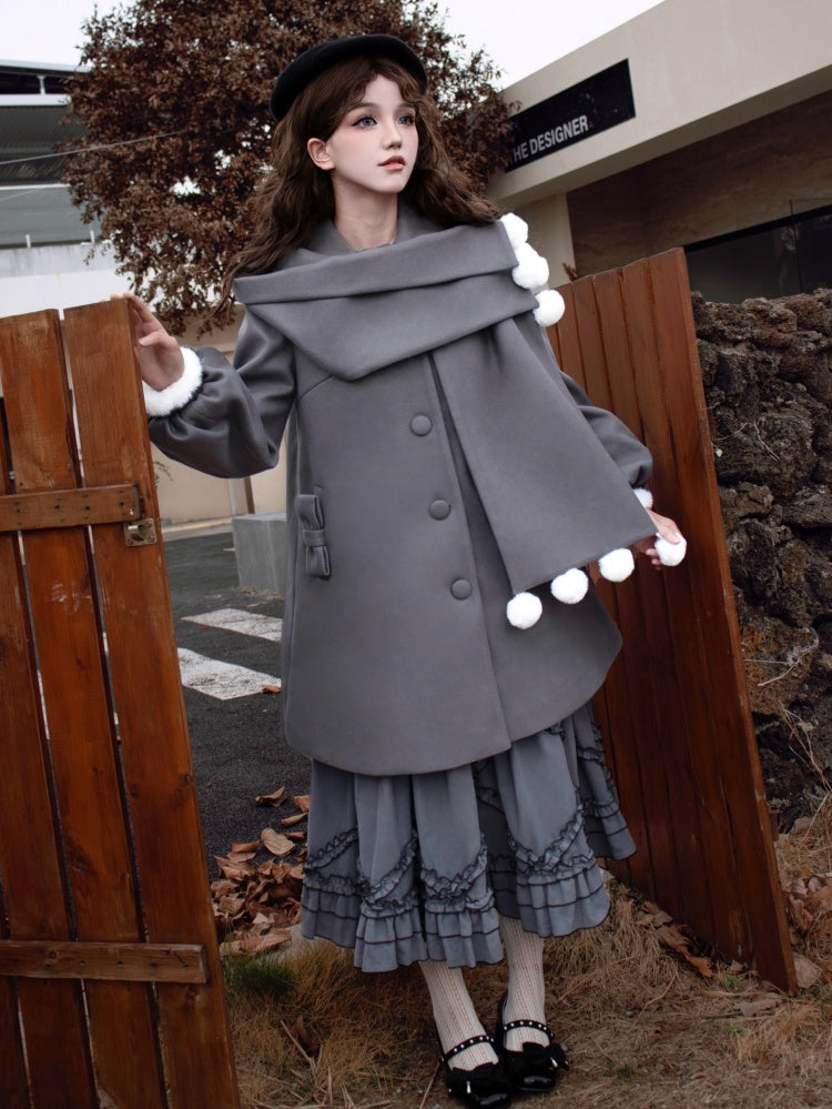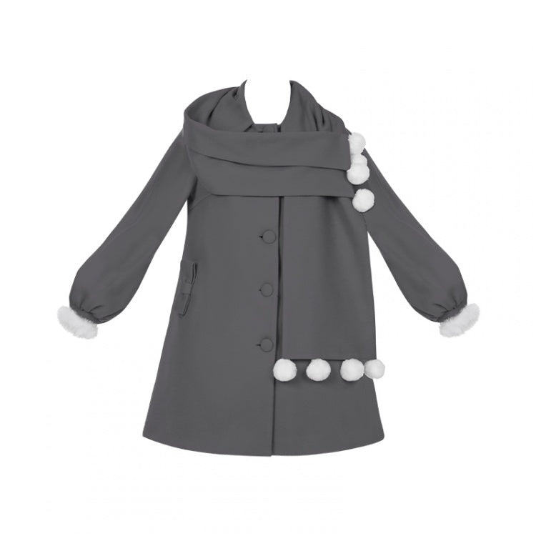 ポンポンスカーフカラー、グレーフリース裏地ウールコート