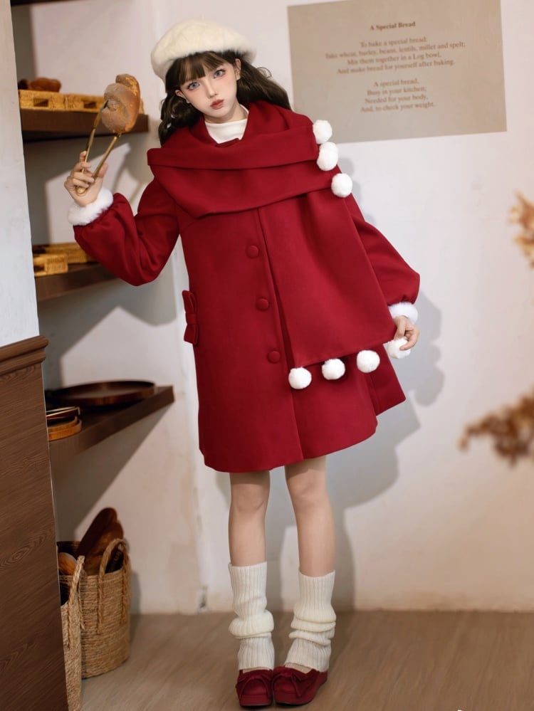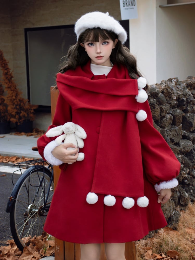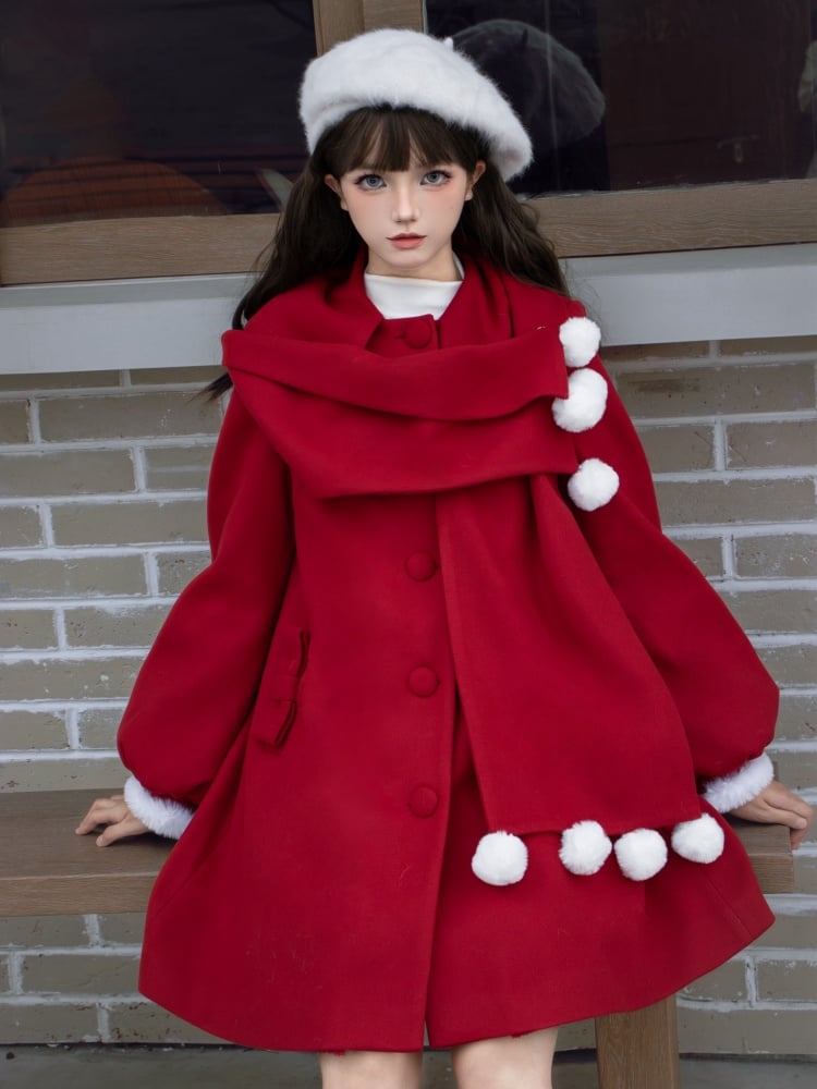 ポンポンスカーフカラー、レッドの新年衣装、ウールコート、プラッシュトリムカフス