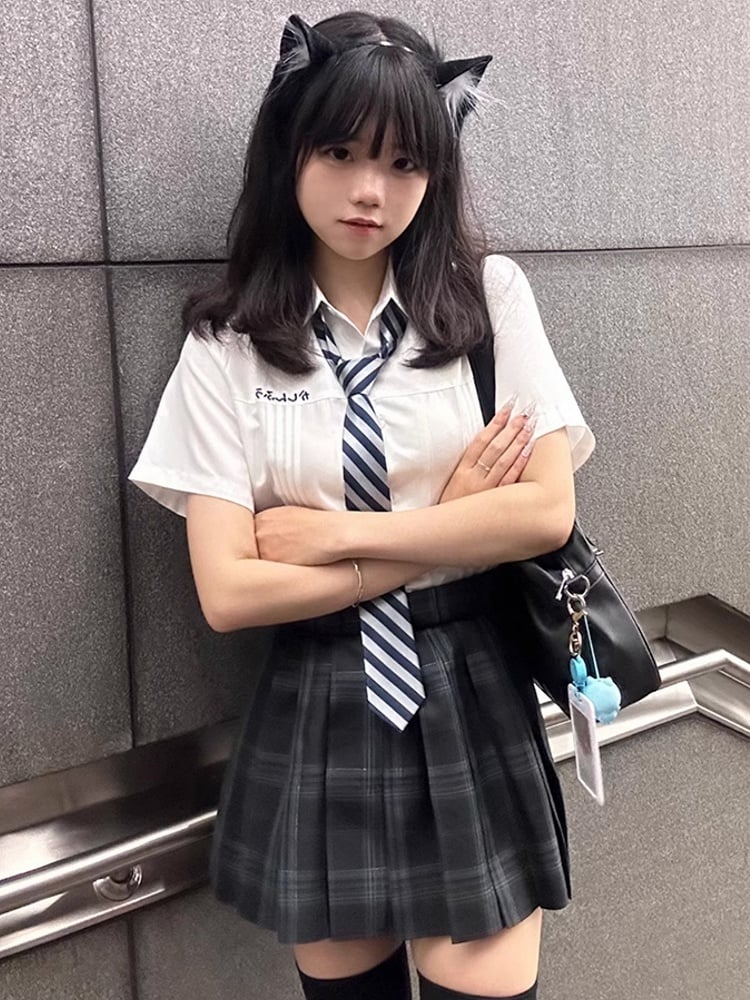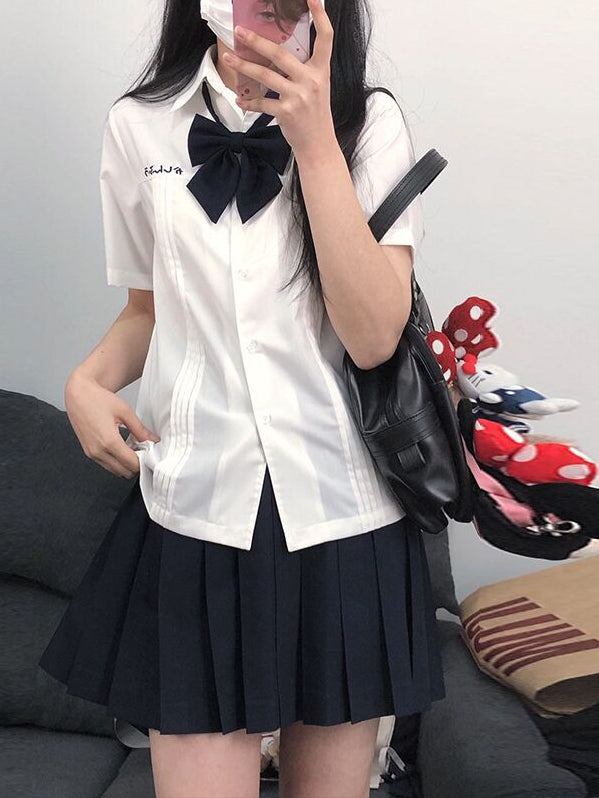 プレッピーなショート丈ディテールのホワイトプリーツバージョンスタイルスリーブカラーシャツ