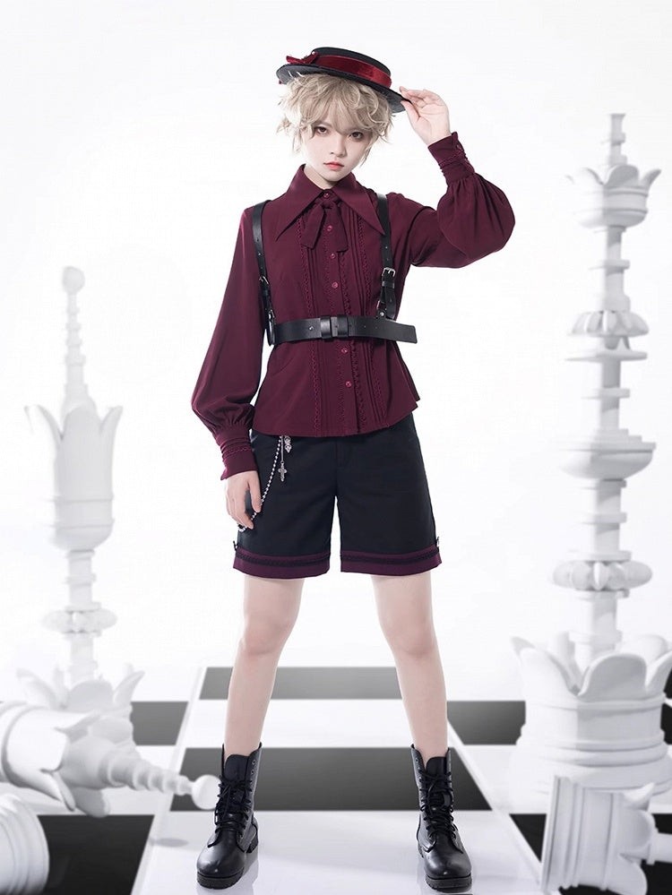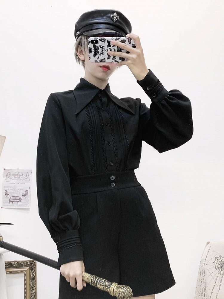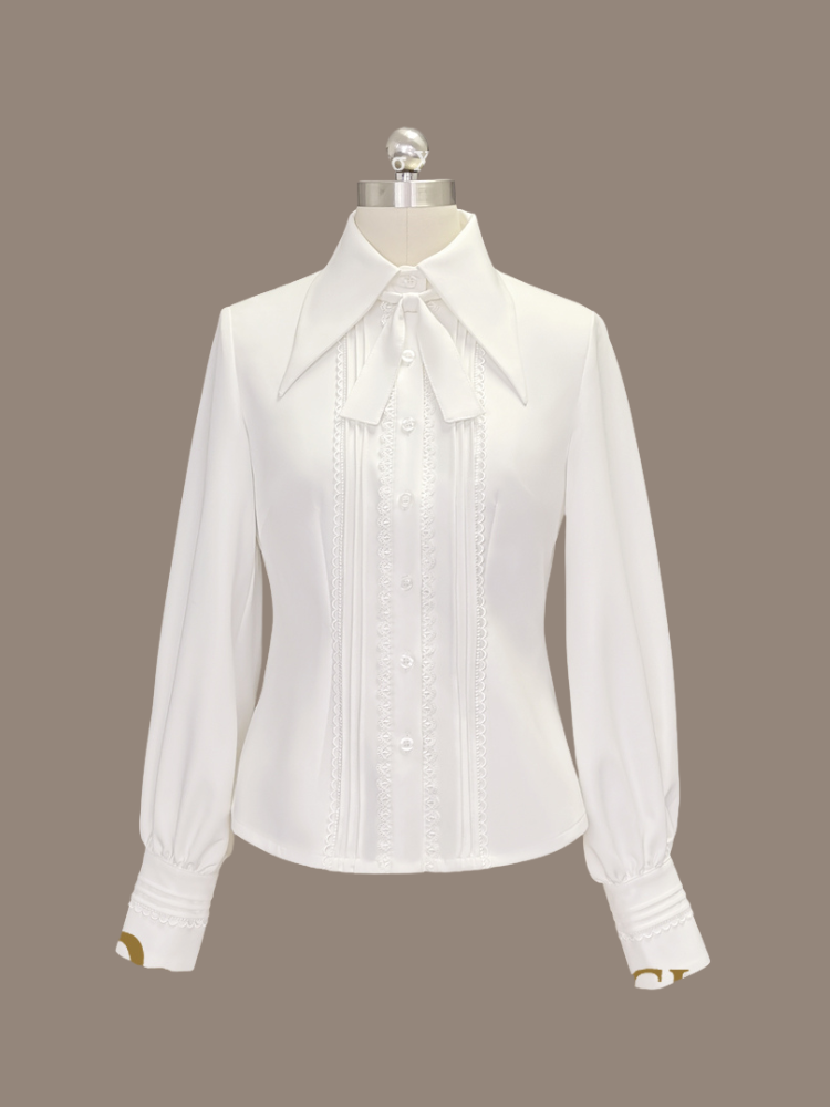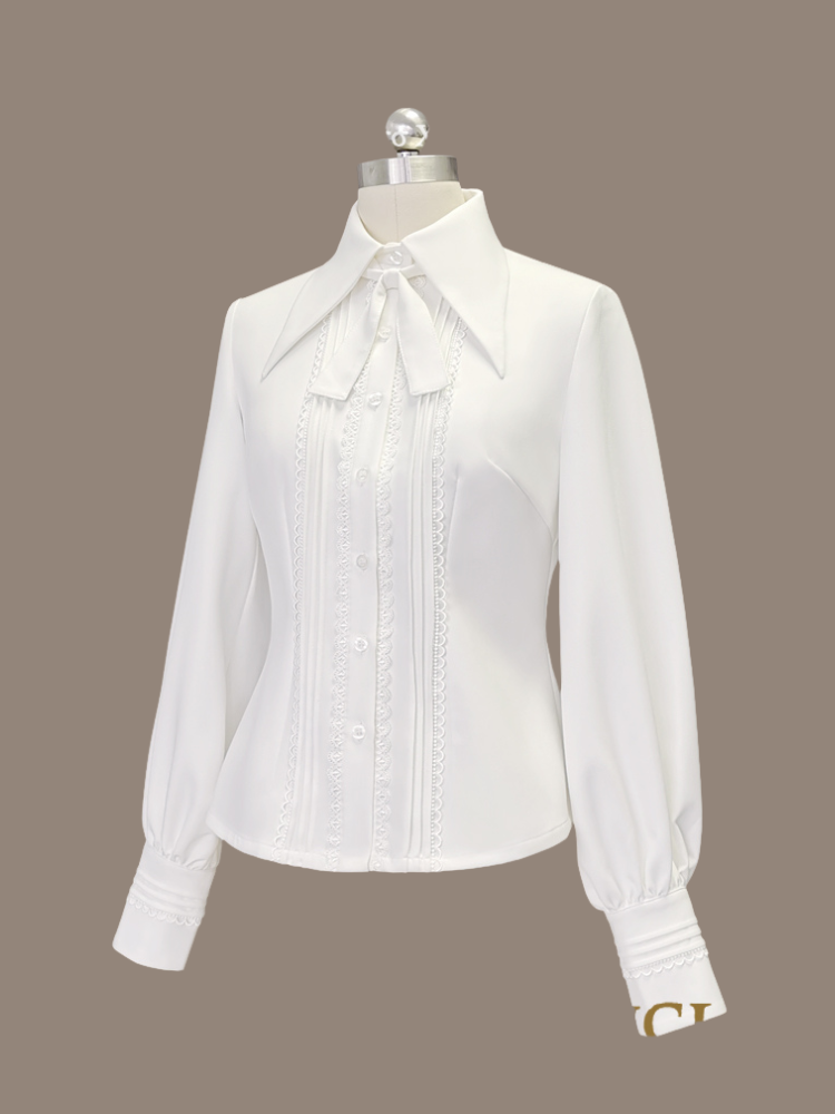 折り返しポイントカラー、プリーツとレースのディテール、長袖プリンスシャツ、4色展開