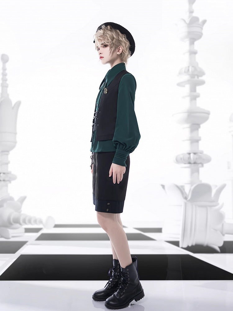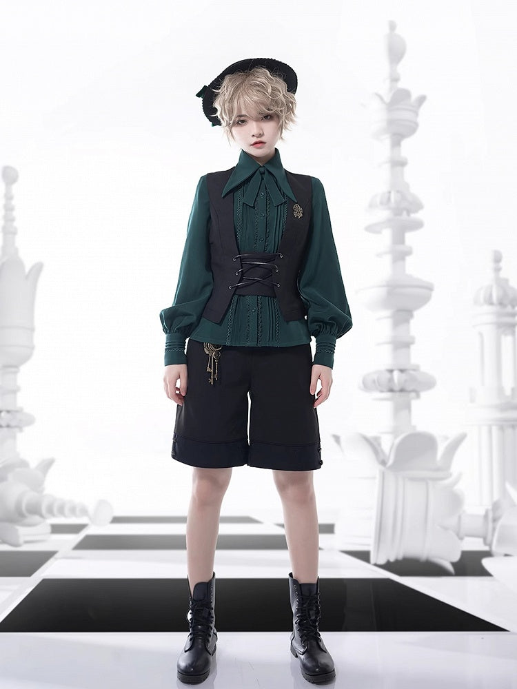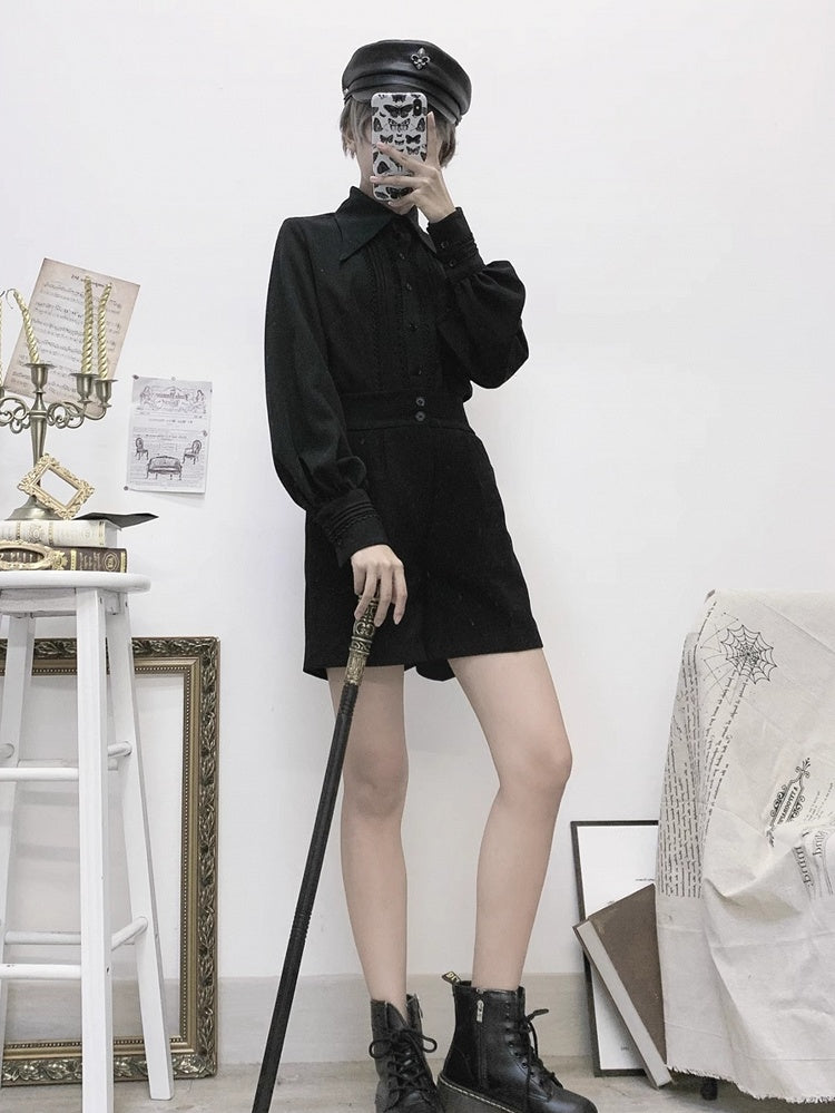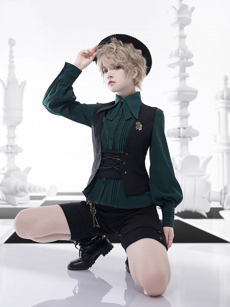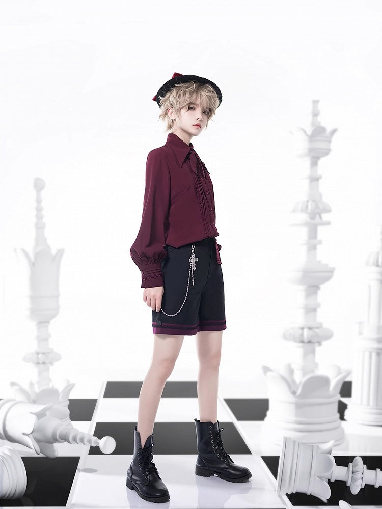 折り返しポイントカラー、プリーツとレースのディテール、長袖プリンスシャツ、4色展開