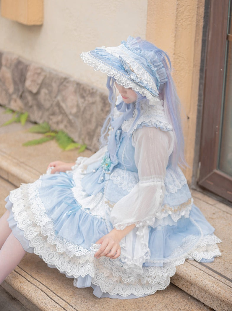 青と白のオールドスクールロリータファッションドレス 蝶結びディテール JSK セット