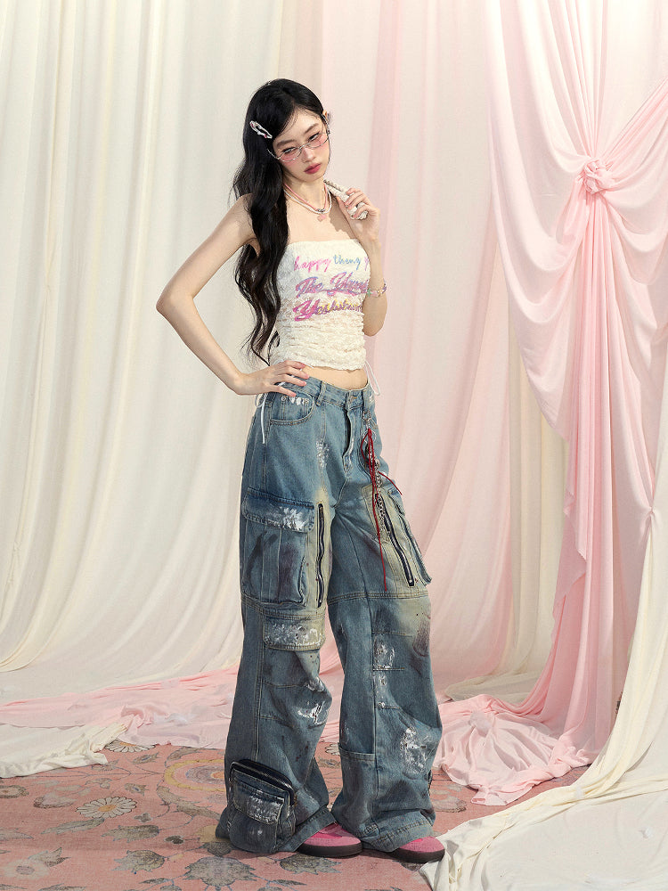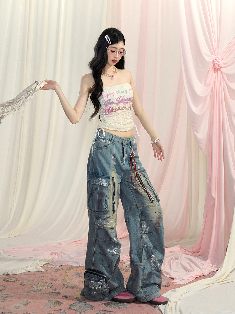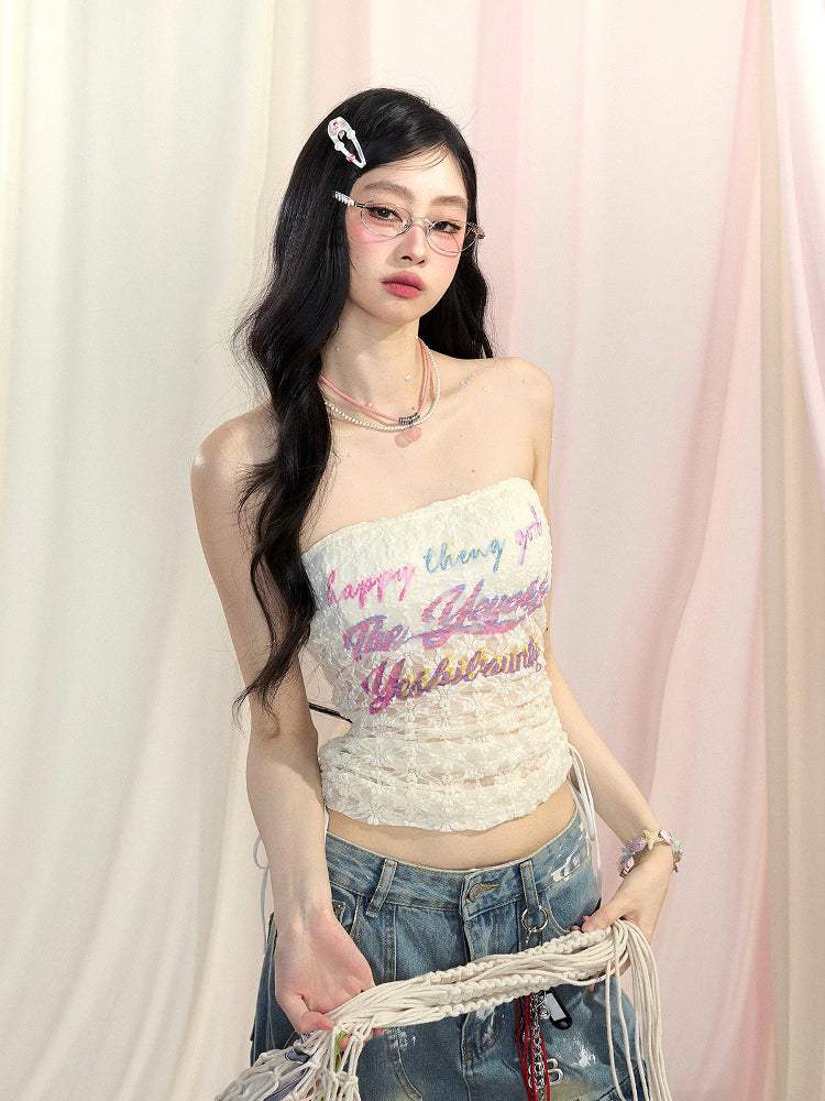 アプリコットレースのドローストリングウエストレタープリントのグラマラスストラップレストップ