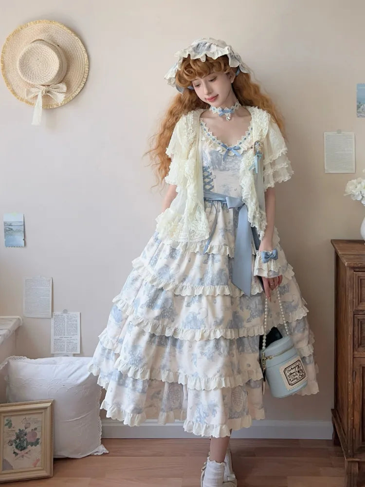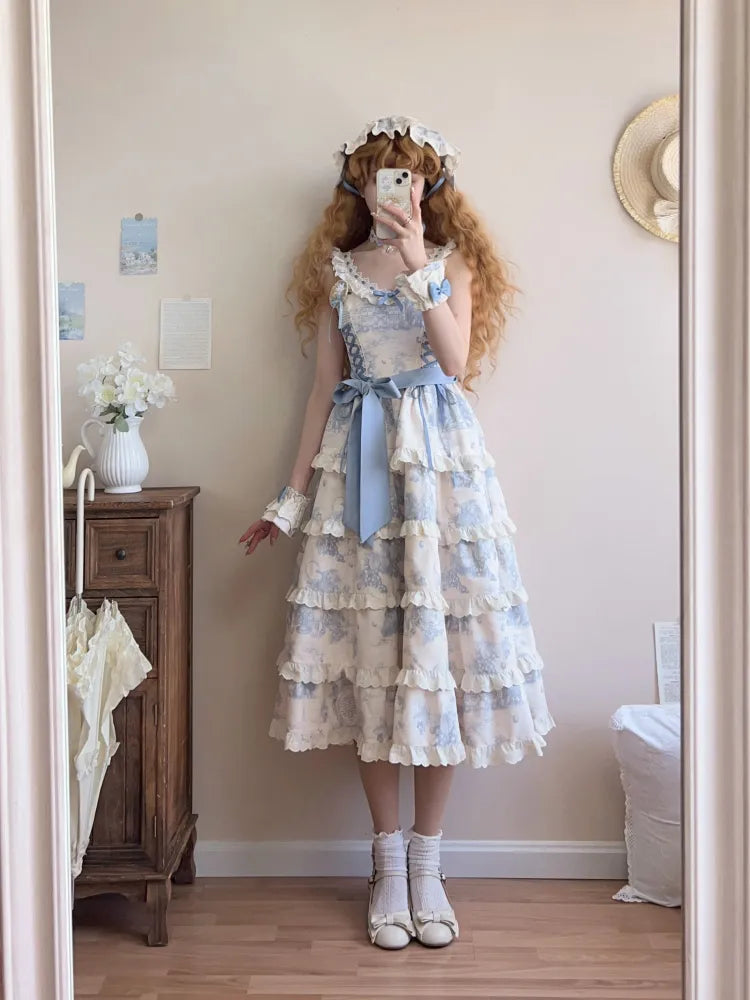 青と白のオールドスクールロリータファッションドレス 蝶結びディテール JSK セット
