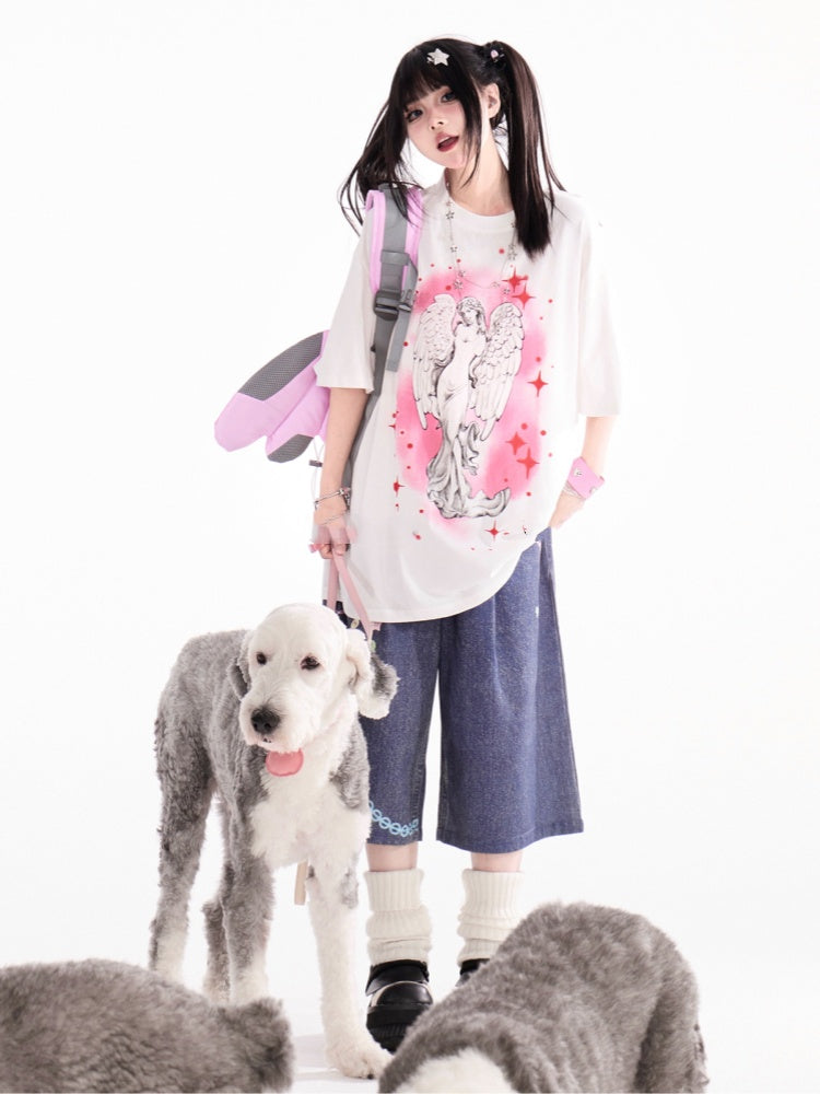 ホワイトラウンドネックエンジェル像プリントルーズTシャツ