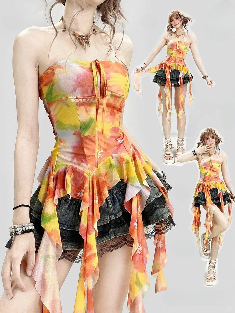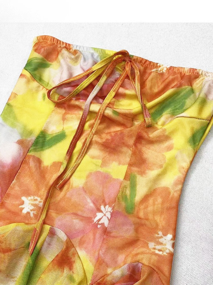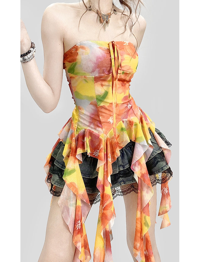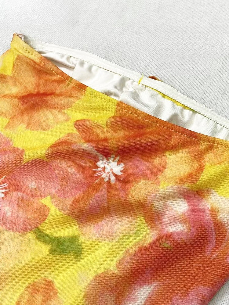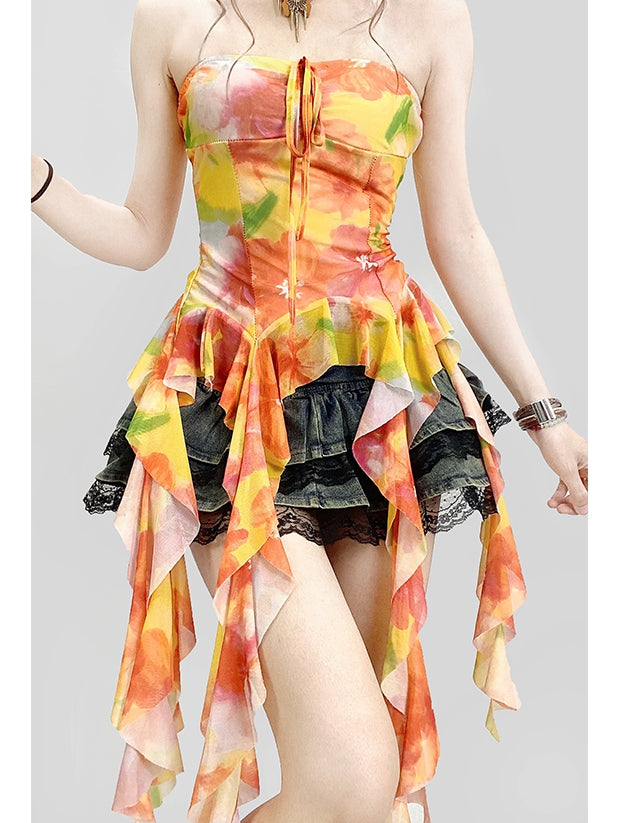 オレンジのホリデーフローラルプリントカスケーディングフリルアクセントチューブトップ