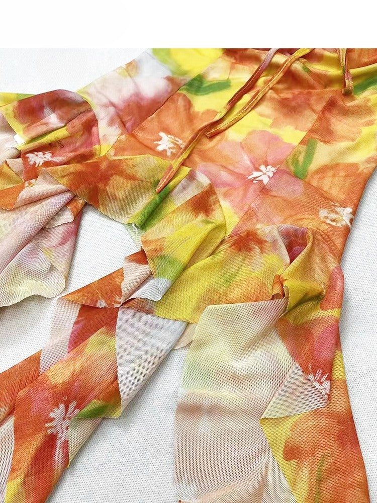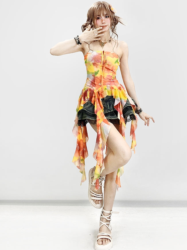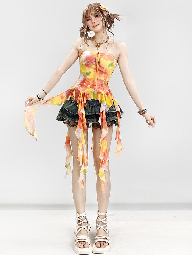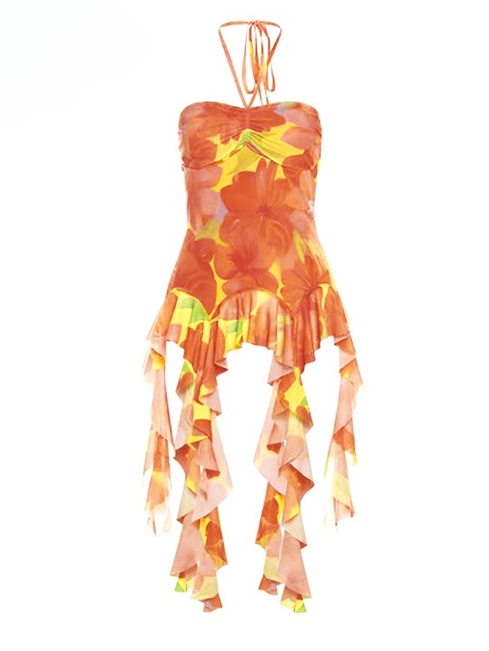 プリントトップ ラッフルアクセント オレンジチューブ ホリデーフローラルカスケーディング