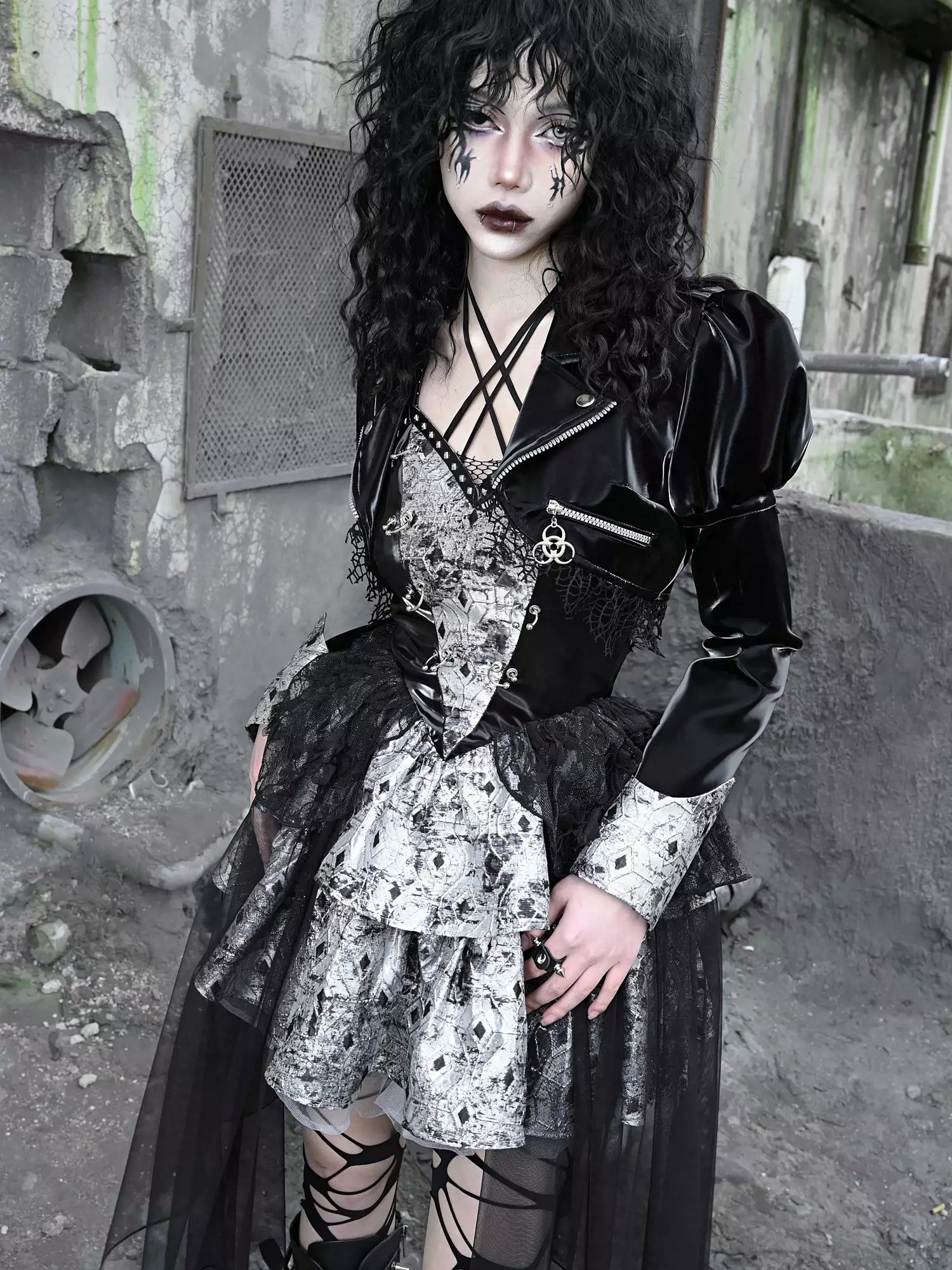 このPUサスペンダーパンクドレスは、キュートさとエッジの効いたデザインが絶妙に融合!ホルターネックデザインが肩を美しく見せ、メッシュとチュールがフェミニンな雰囲気をプラス。メタリックなアクセントがクールでパンクな雰囲気を演出。シアートップスを合わせれば、個性的なルックが完成します。