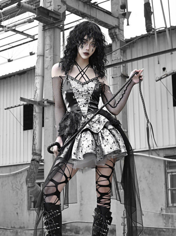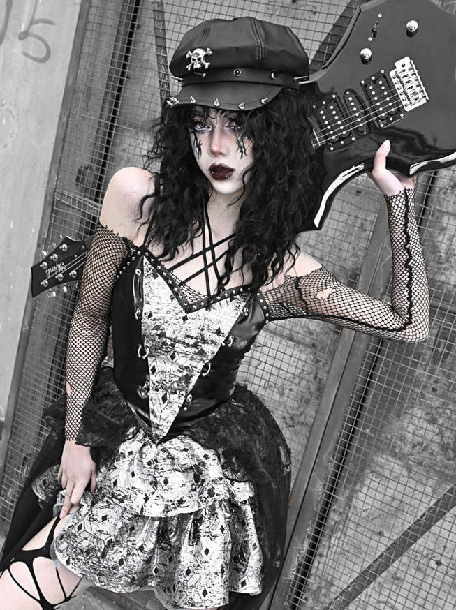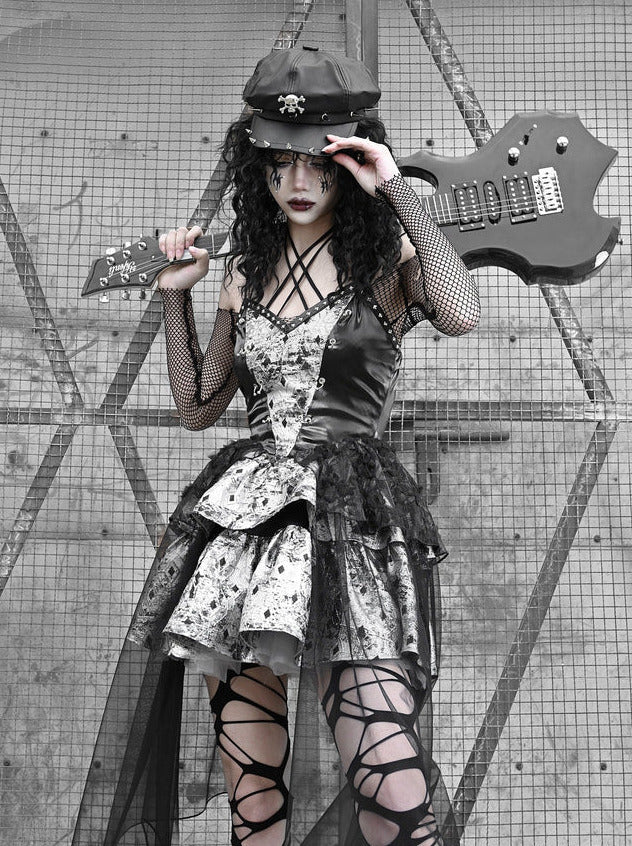 PUサスペンダーパンクホルターネックメッシュメタリックオフショルダーチュール+トップドレスシアー