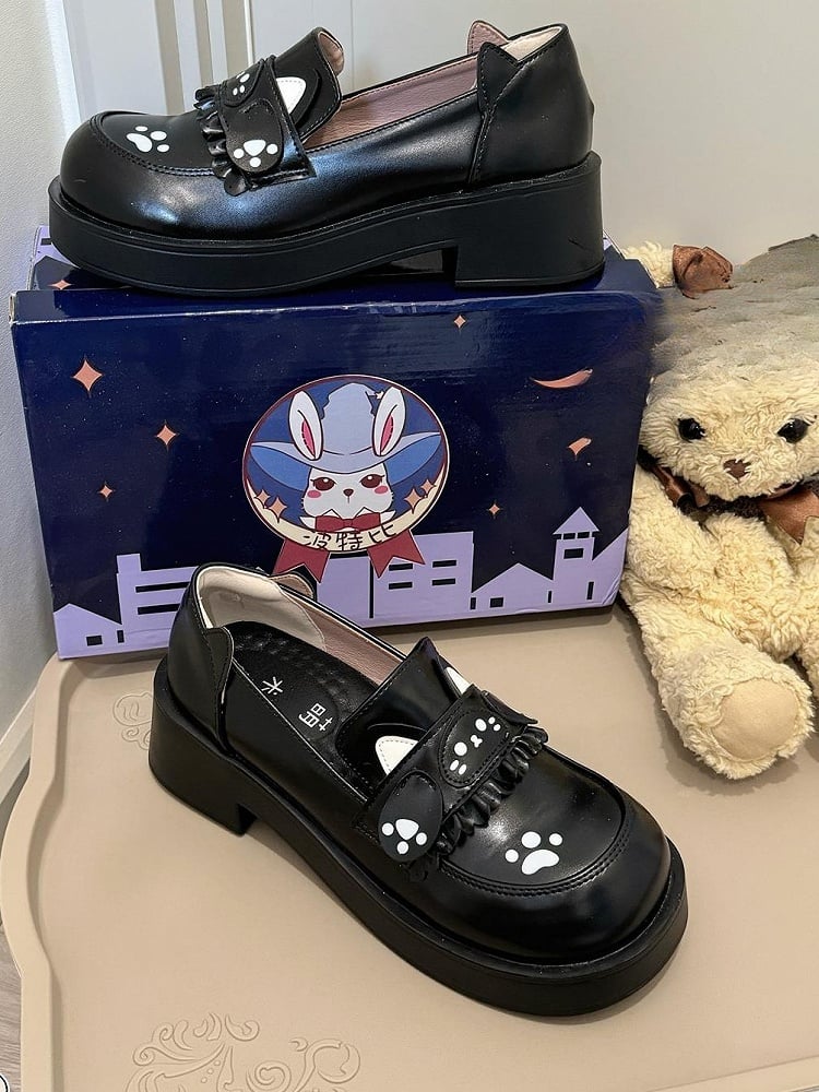 Preppy Style Black PU Slip-On Shoes with Mid-heel, Paw Print & Kitty Ear Accents