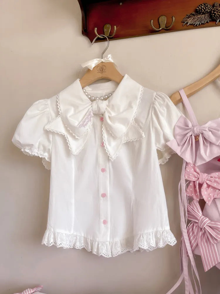 ホワイトのショートパフスリーブの蝶結びカラーシャツ