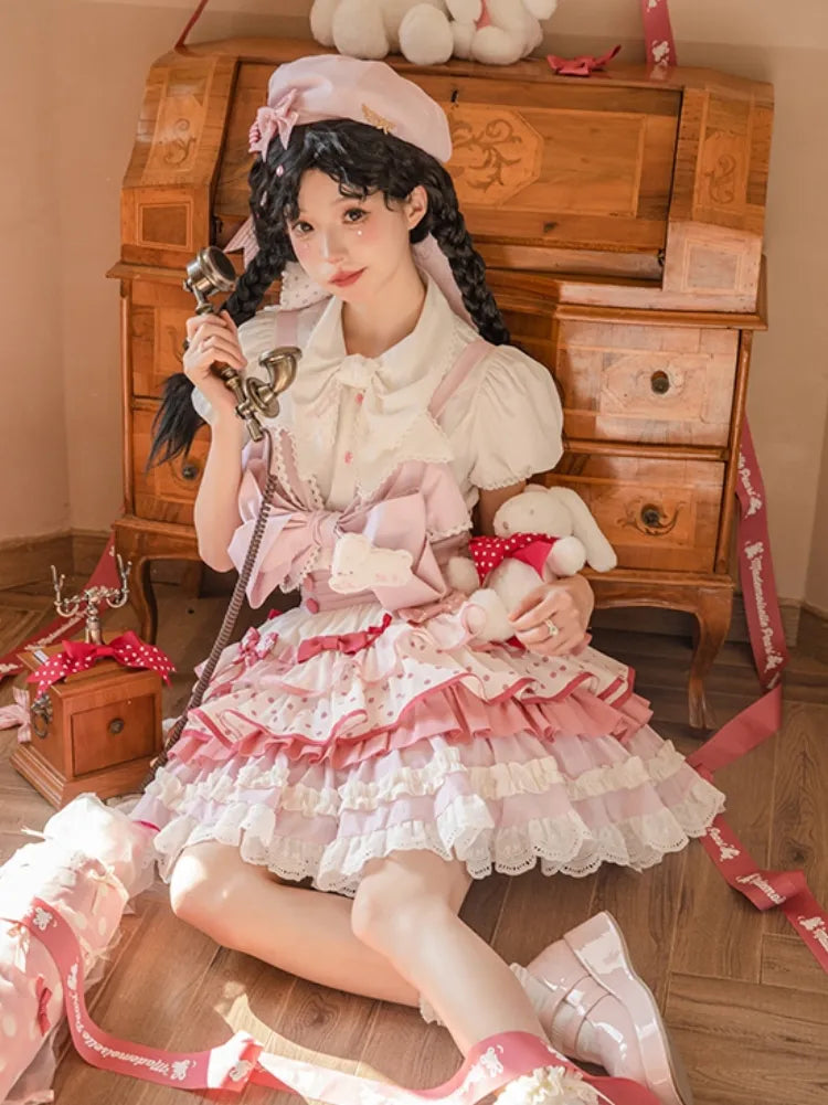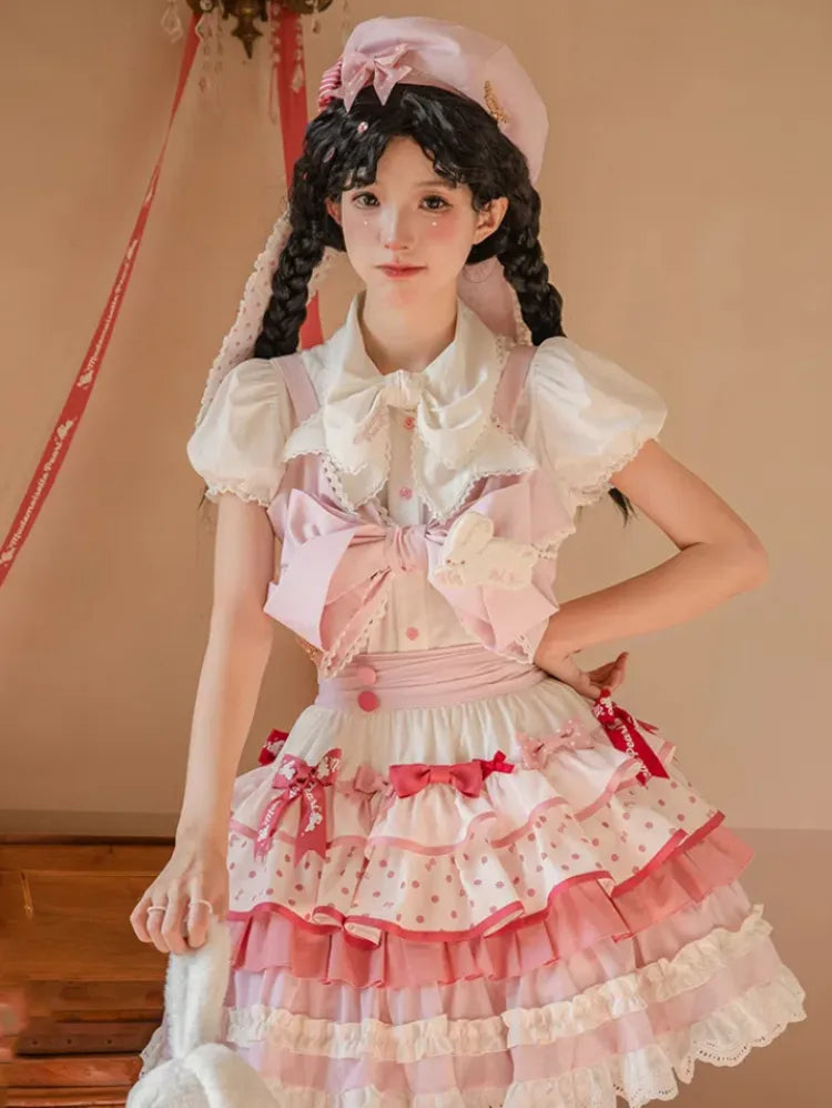 ピンクと白のオールドスクールロリータファッションドレス、蝶結びディテール、ロリータJSKセット
