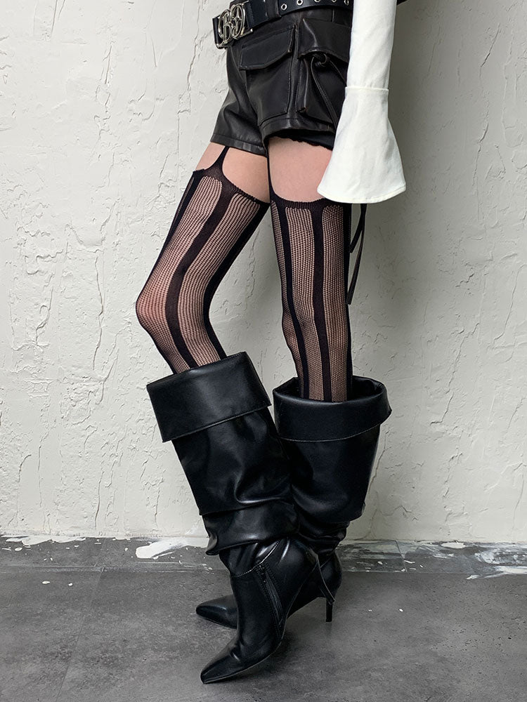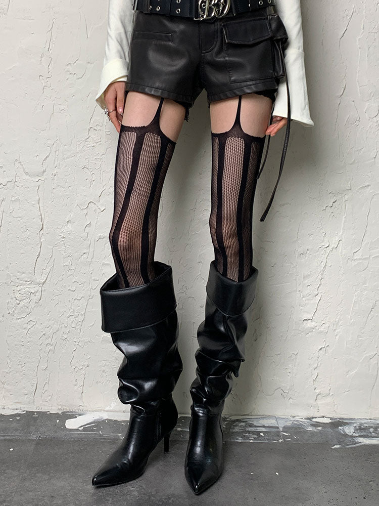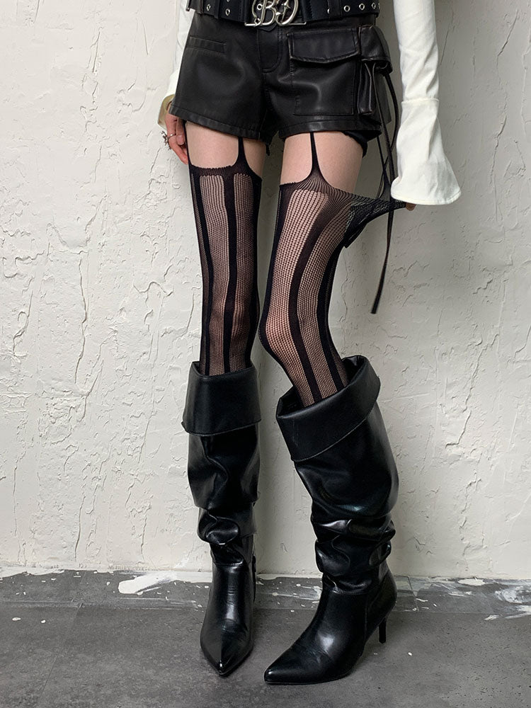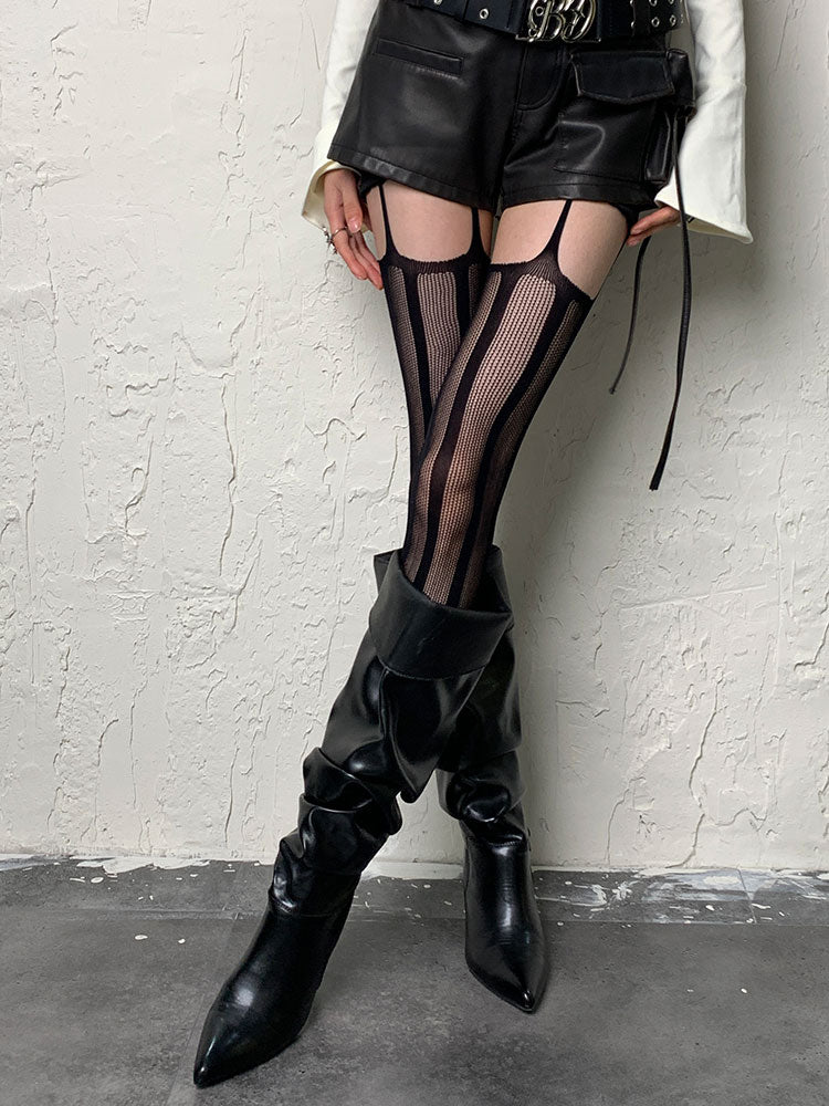 パンクなブラックストライプカットアウトサスペンダータイツ
