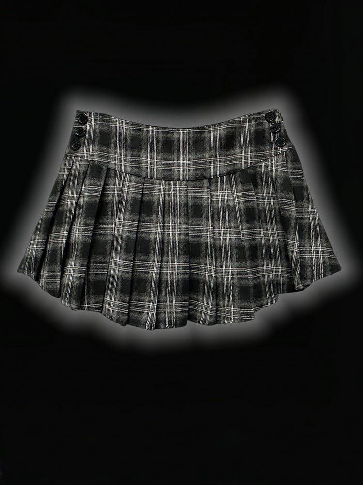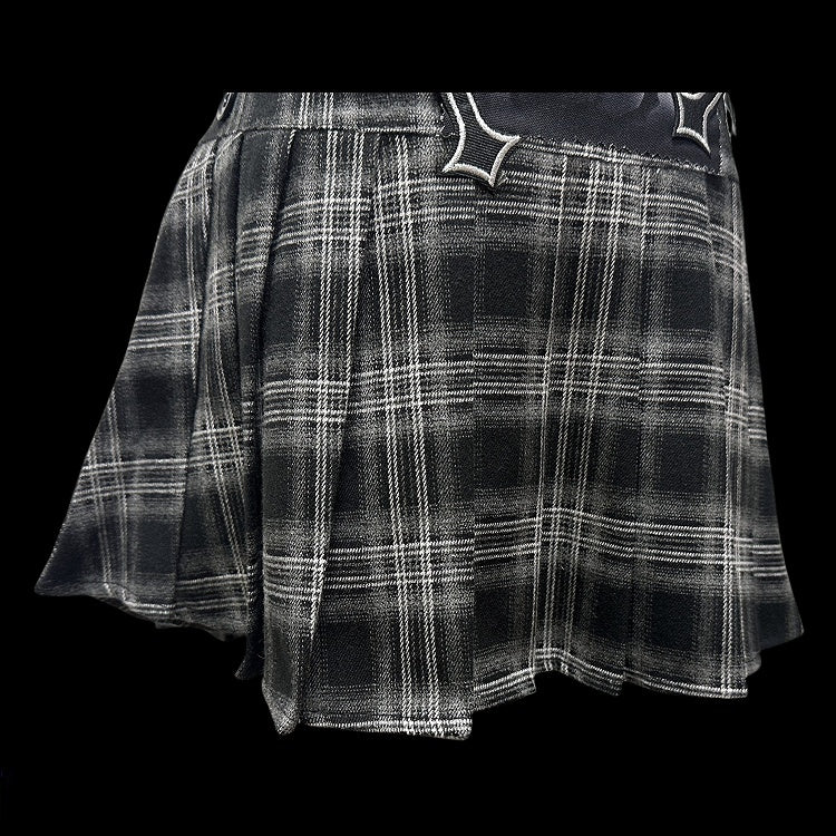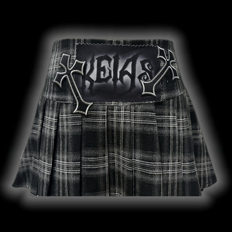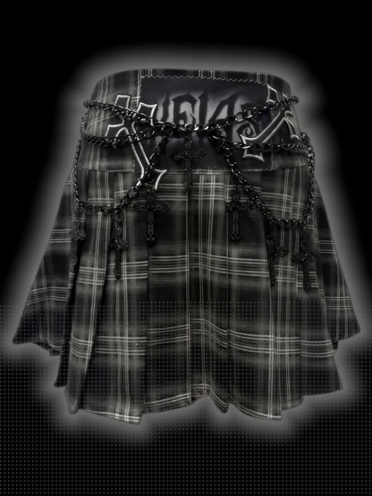 パンクグレーのクロスアップリケ付きローウエストチェック柄プリーツミニスカート(フリーウエストチェーン付き)