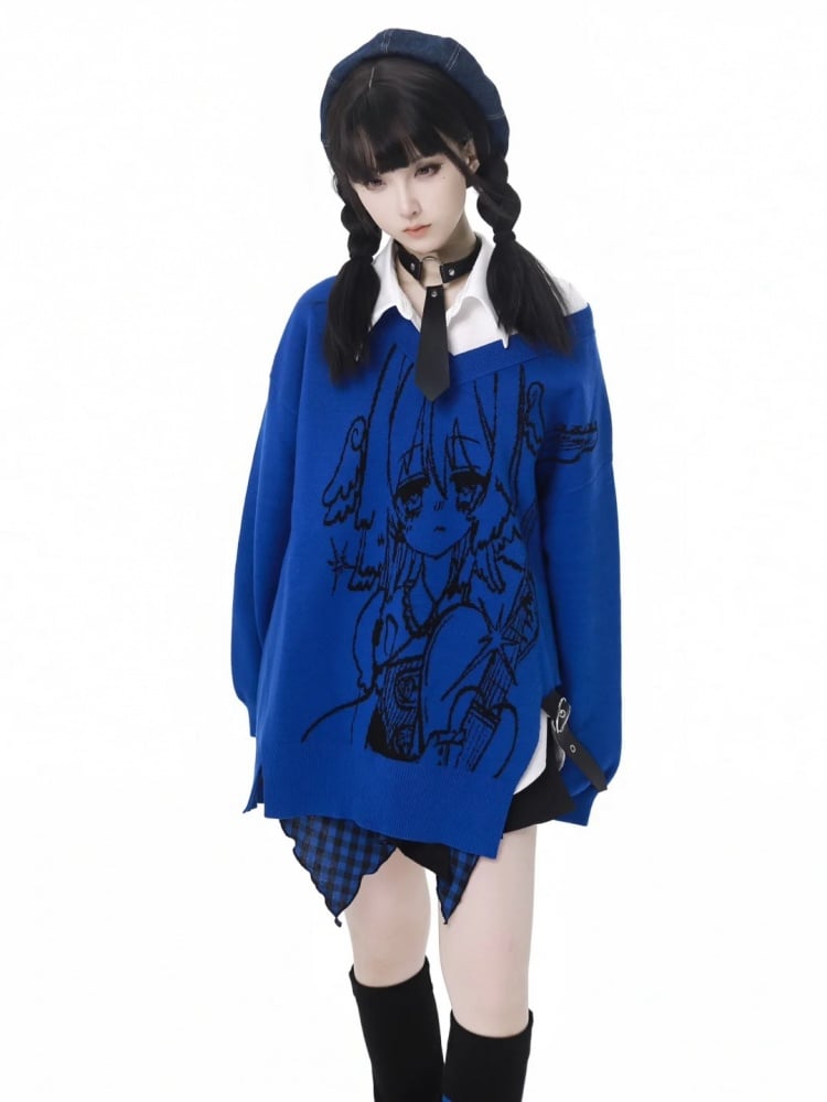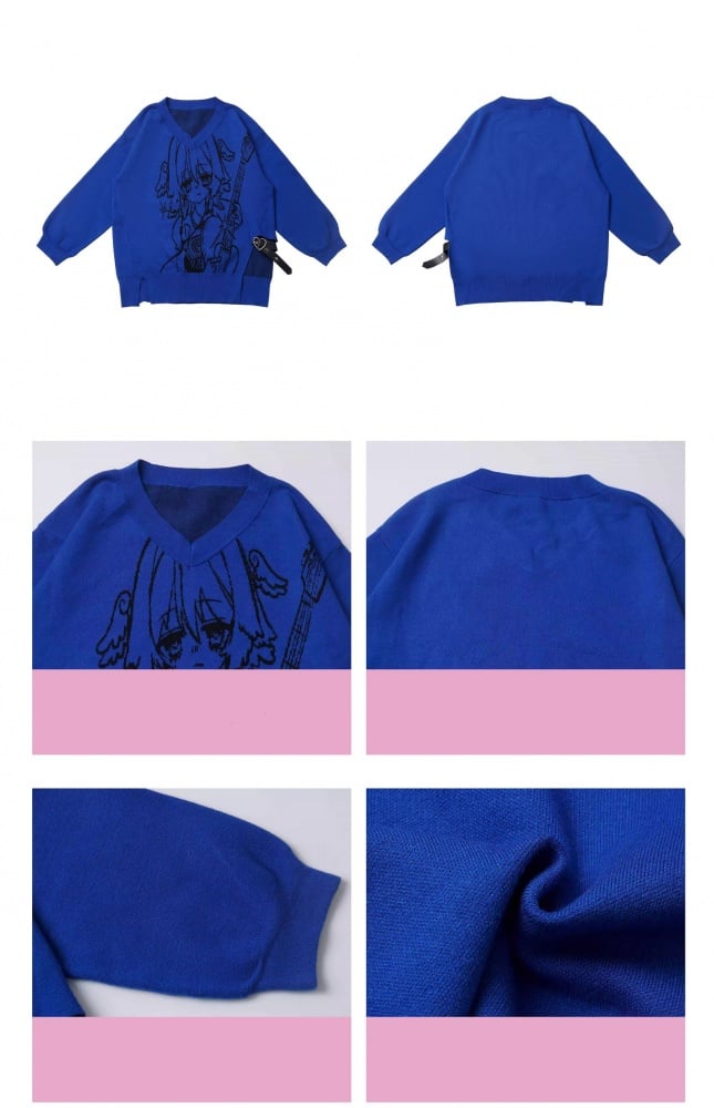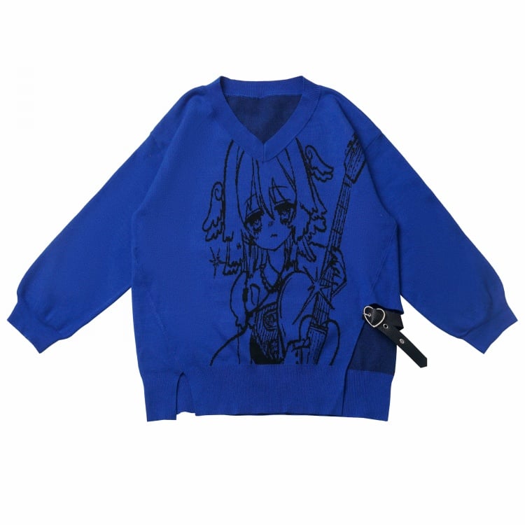 パンクロックガール柄 ブルー Vネック セーター ハート PU バックル付き