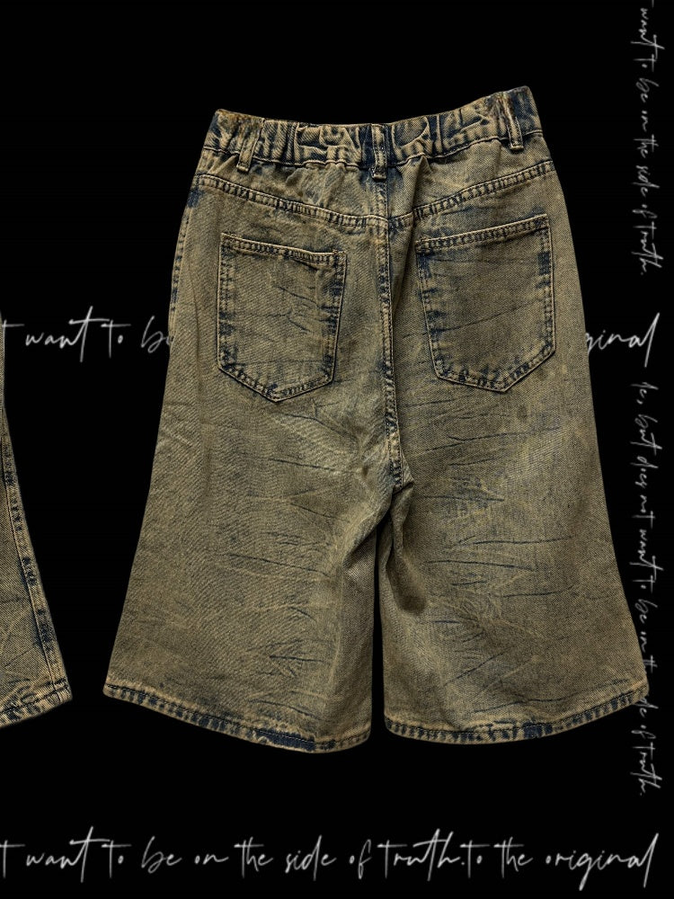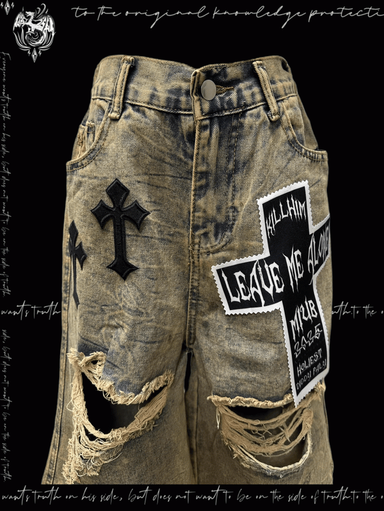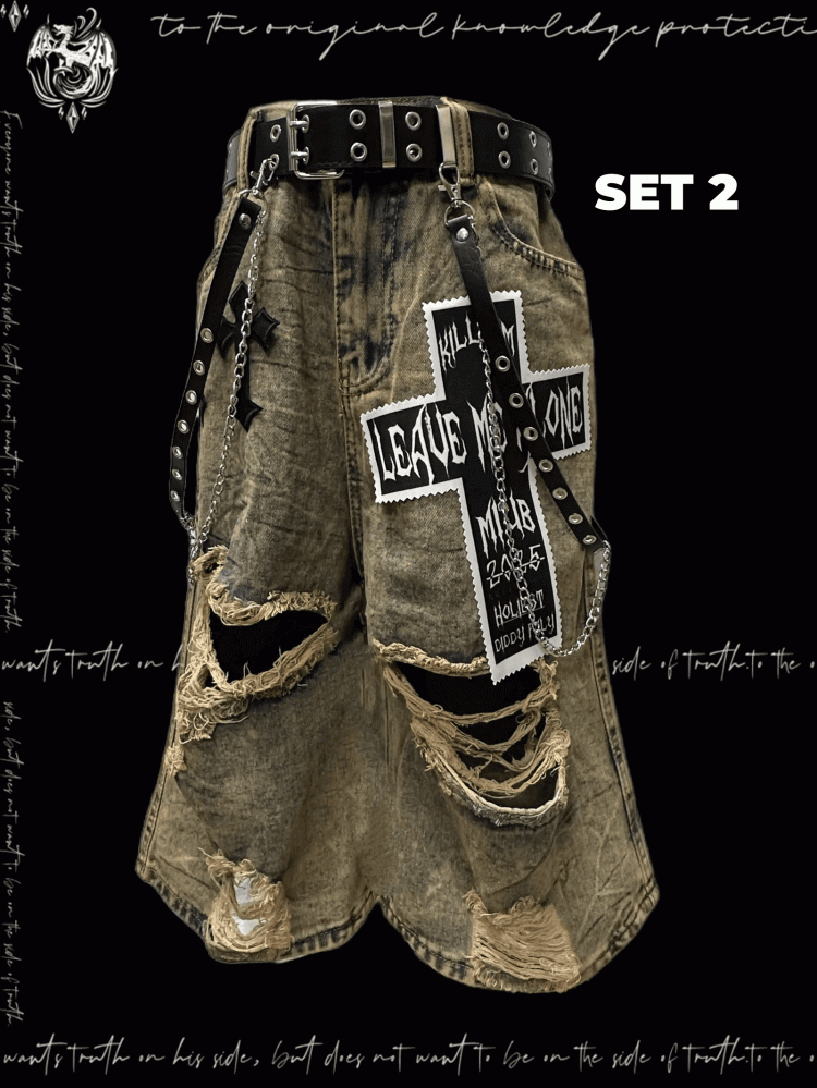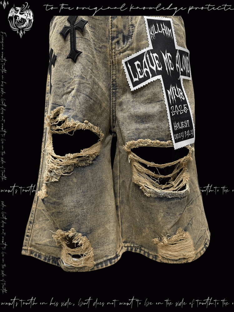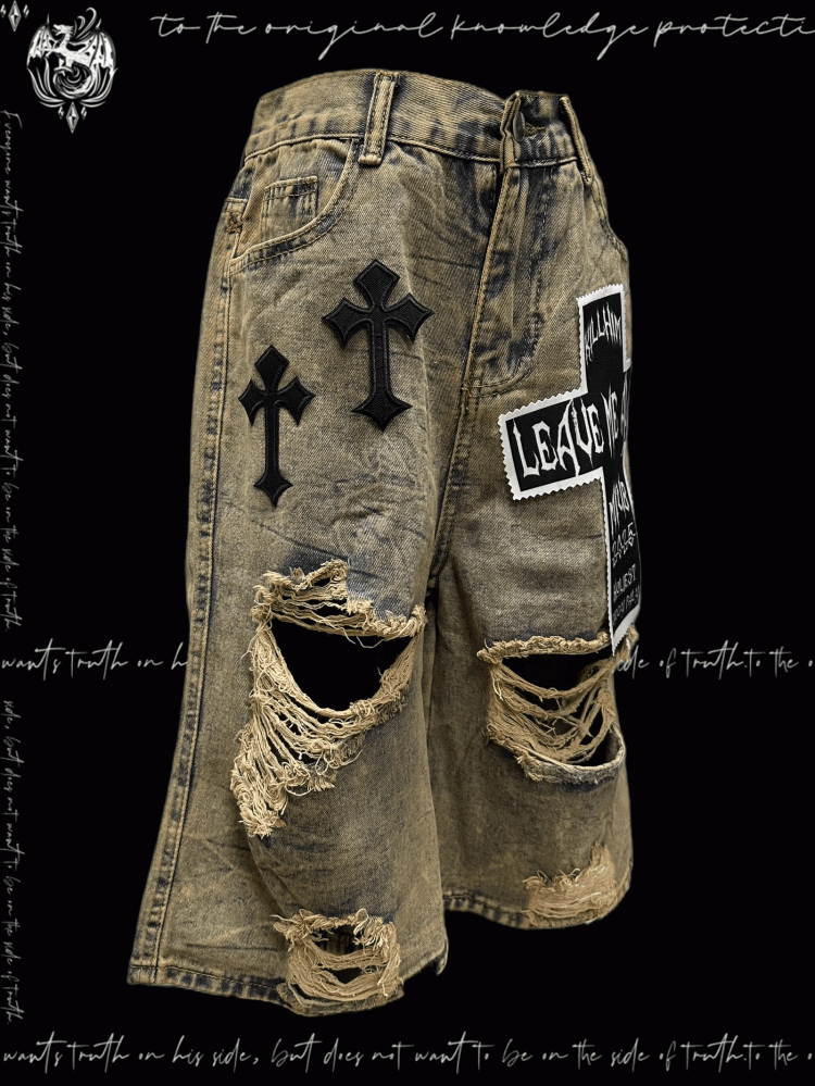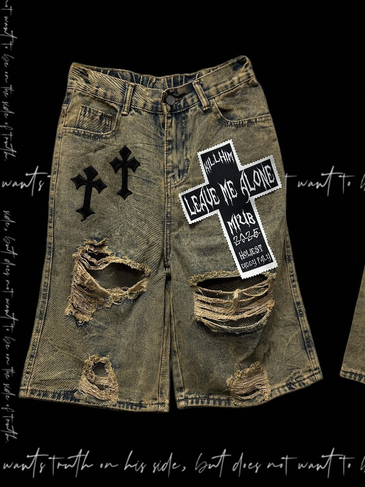 ウェイストランドパンククロスアップリケイエローディストレストホールY2Kデニムショーツ