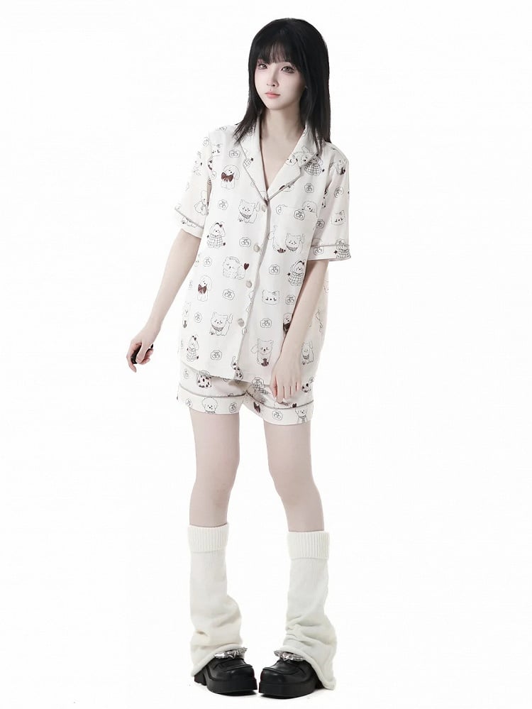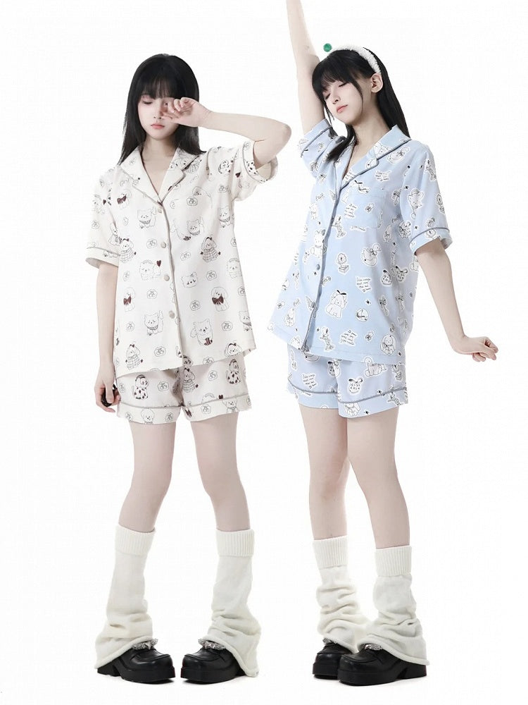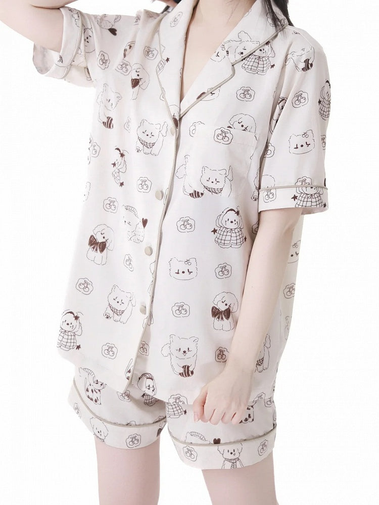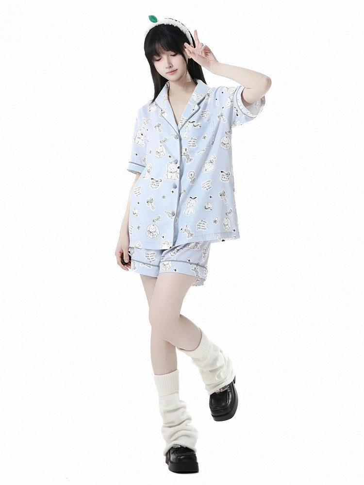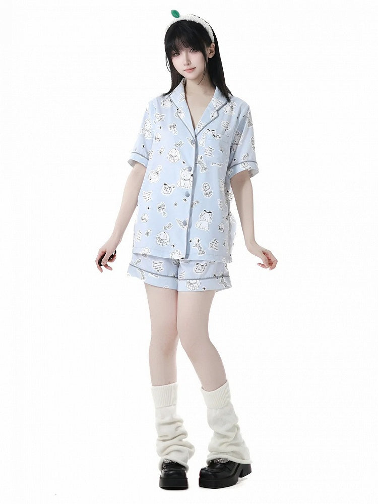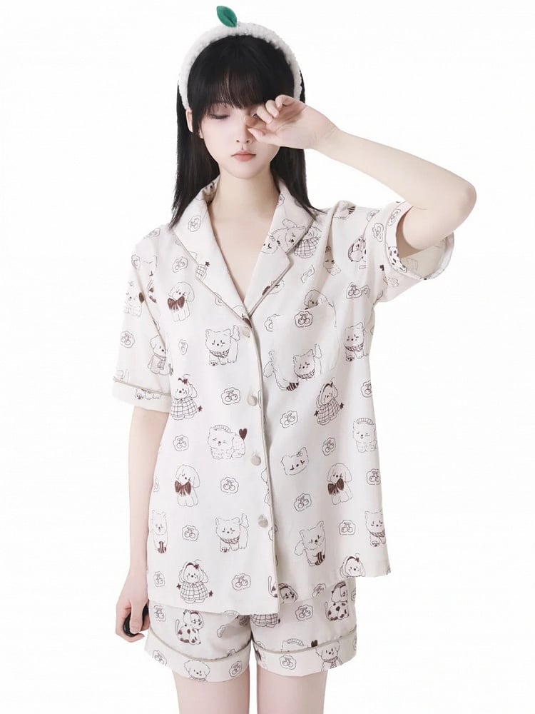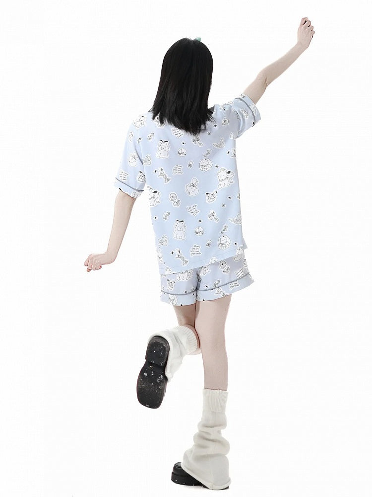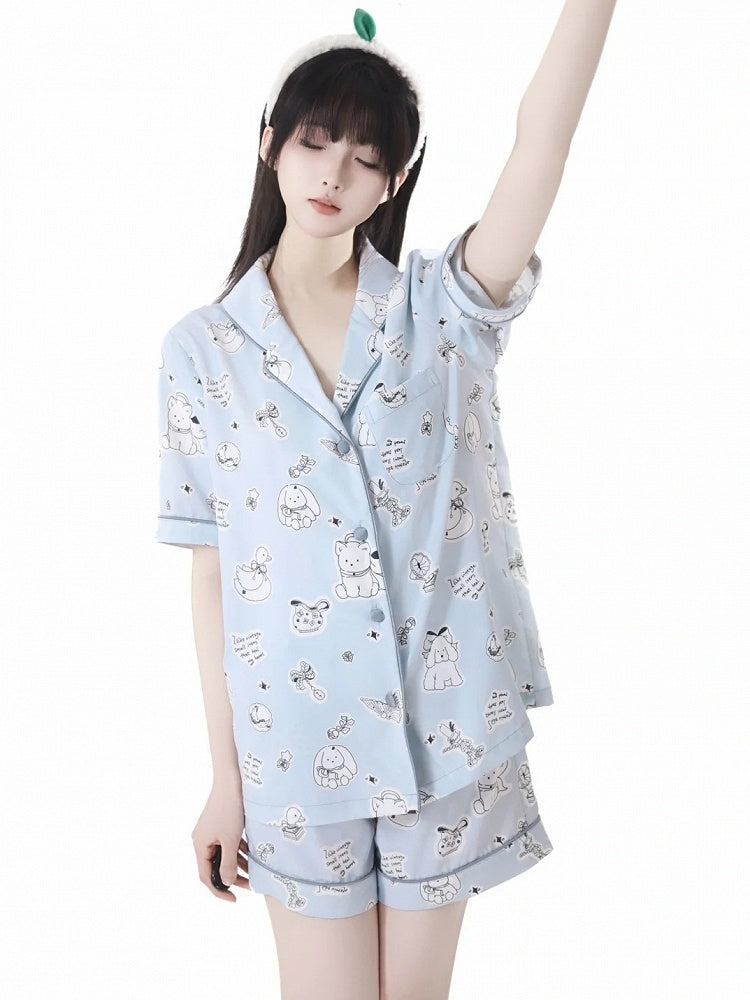 ライトブルー/クリーミーイエローのキュートな子犬柄パジャマセット