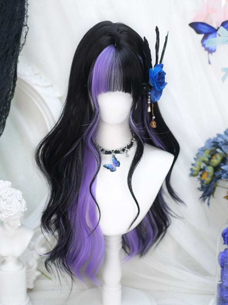 紫と黒のハイライト、アンダーバスト丈のウェーブウィッグ(エアバング付き)