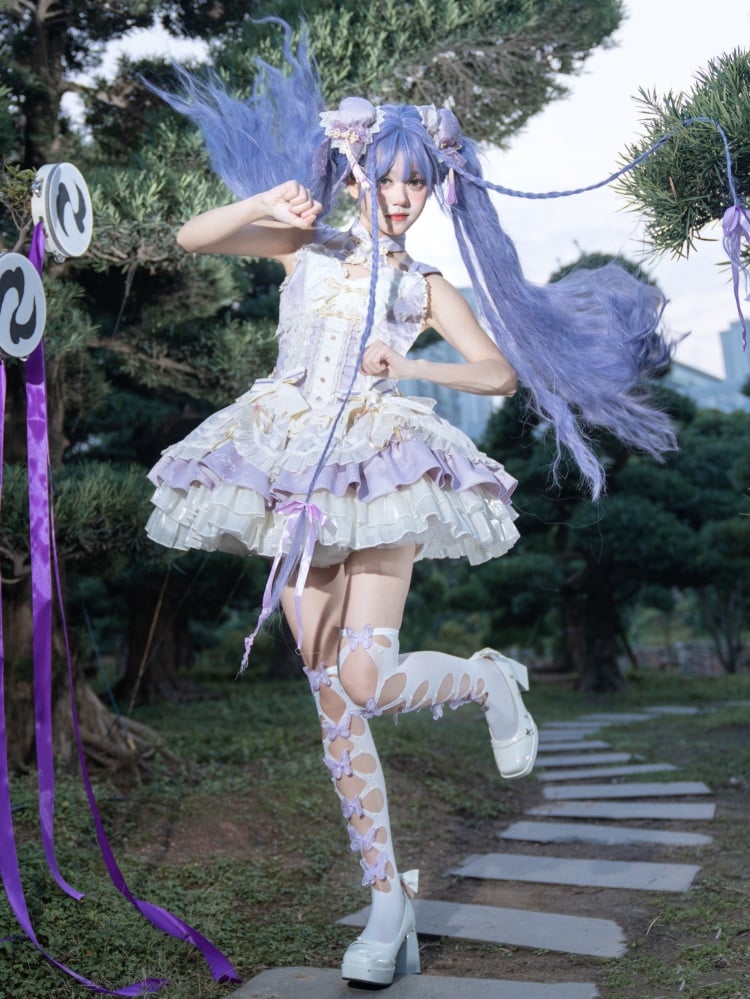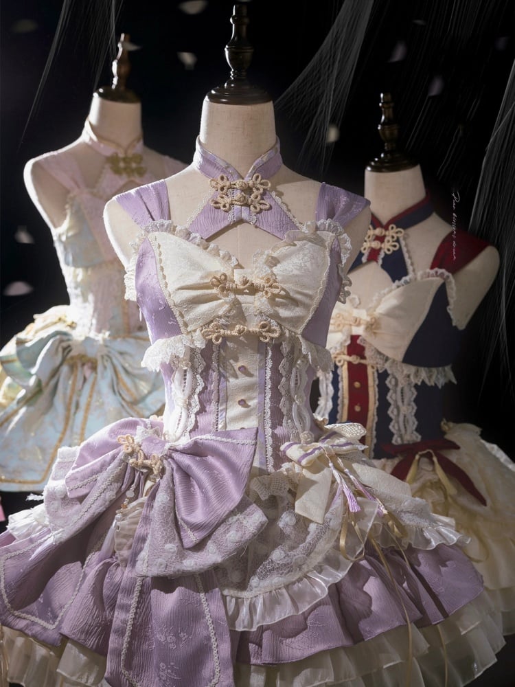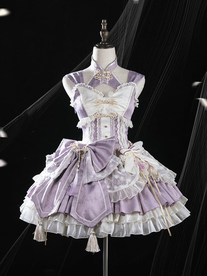 取り外し可能なチャイナドレスの襟、紐が付いた多層フリルスカート、大きな蝶のリボン飾り、サイドジッパー、後ろのゴムとレースアップで胸囲とウエスト周りを調節可能。