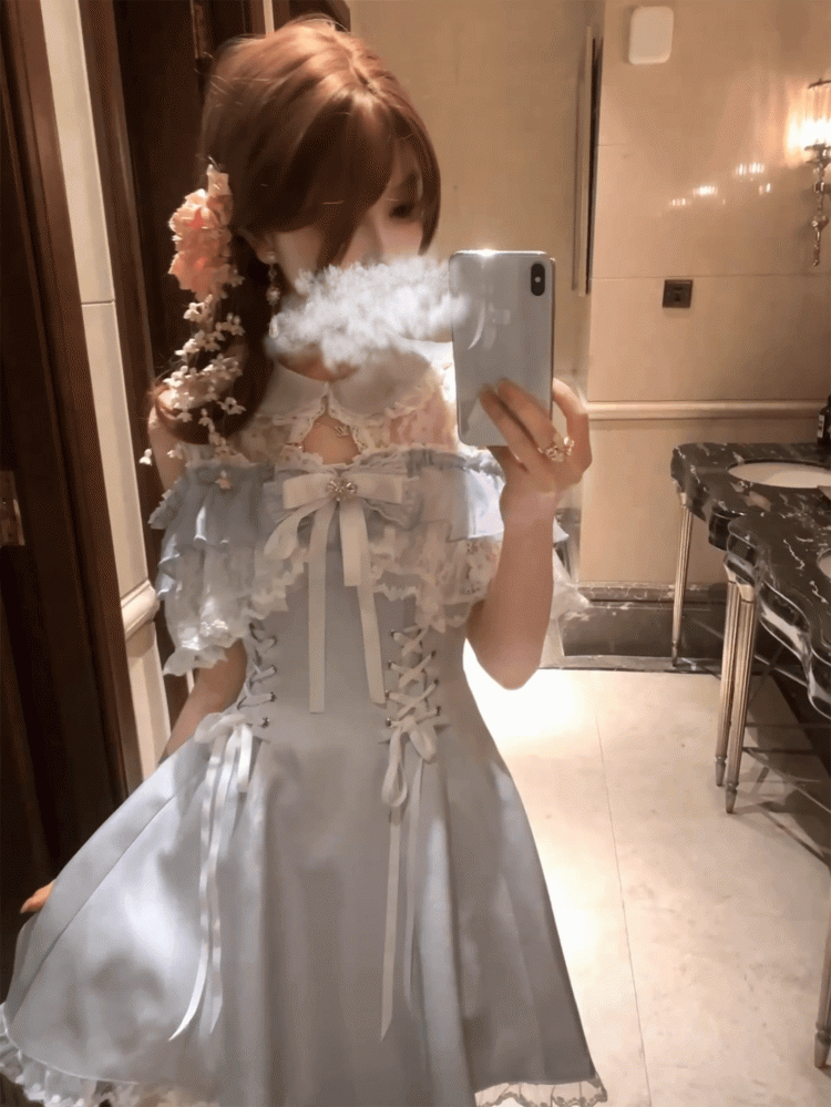 青と白のオールドスクールロリータファッションドレス 蝶結びディテール JSK セット