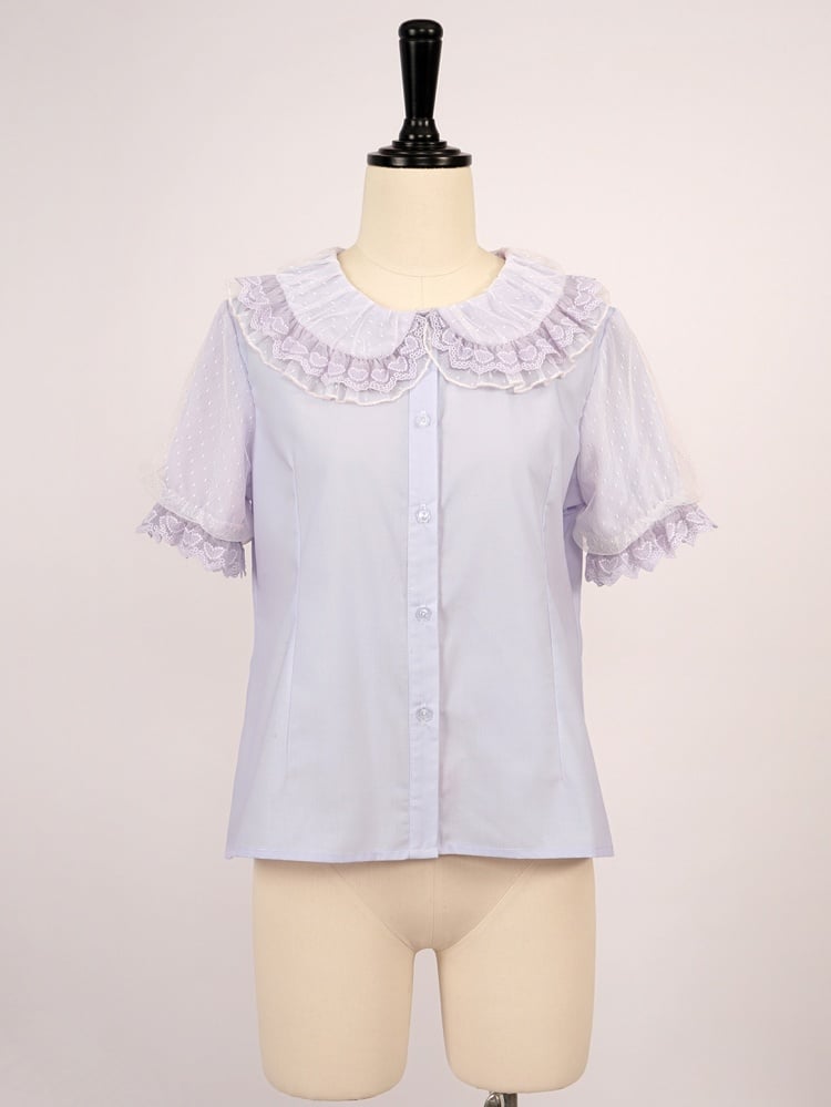 パープルのフリルトリム、ピーターパンカラーの半袖ブラウス