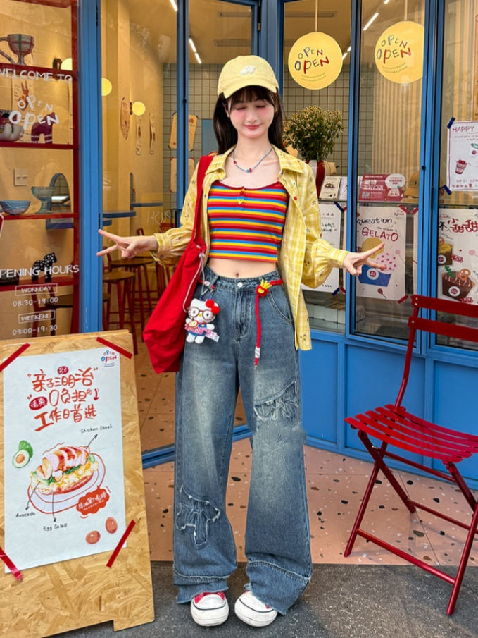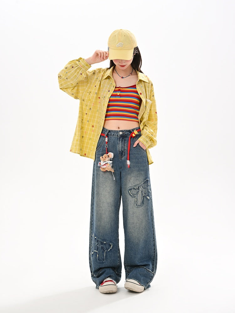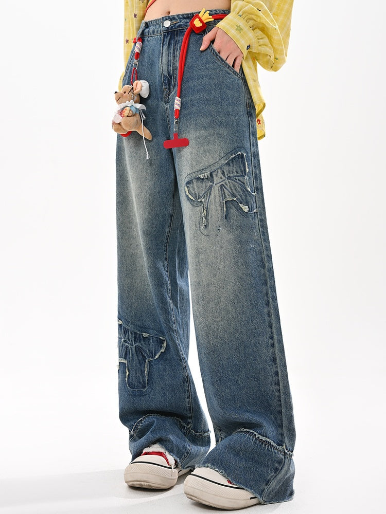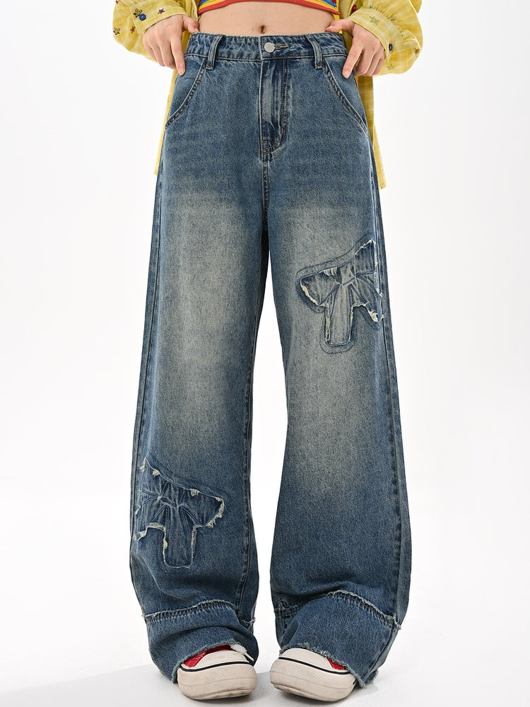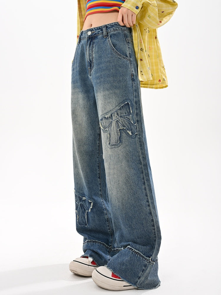 ブルーのローウエスト、蝶結びアップリケ、切りっぱなし裾、ヴィンテージワイドレッグジーンズ