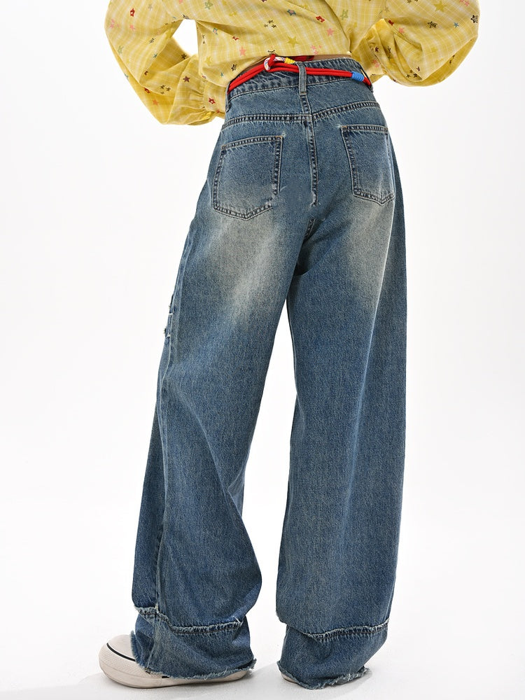 未加工ワイドレッグジーンズ ウエストリボンアップリケ ブルー ローヘム ヴィンテージ