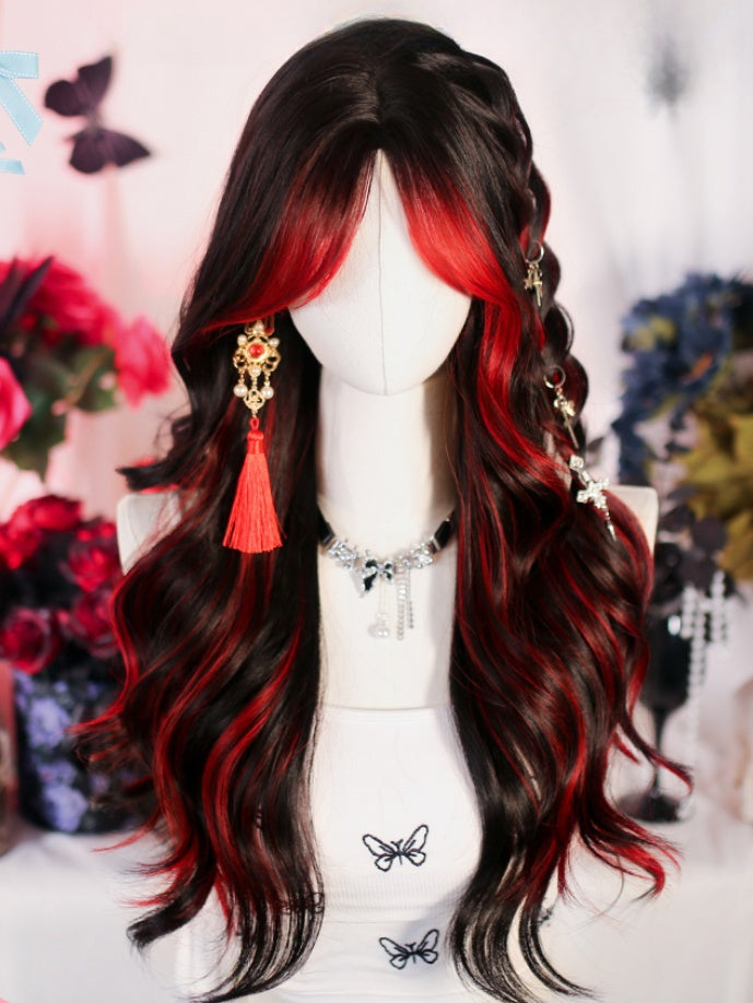 赤と黒のハイライト、アンダーバスト丈のウェーブウィッグ(カーテンバング付き)