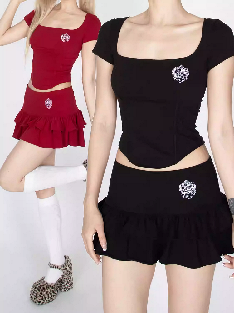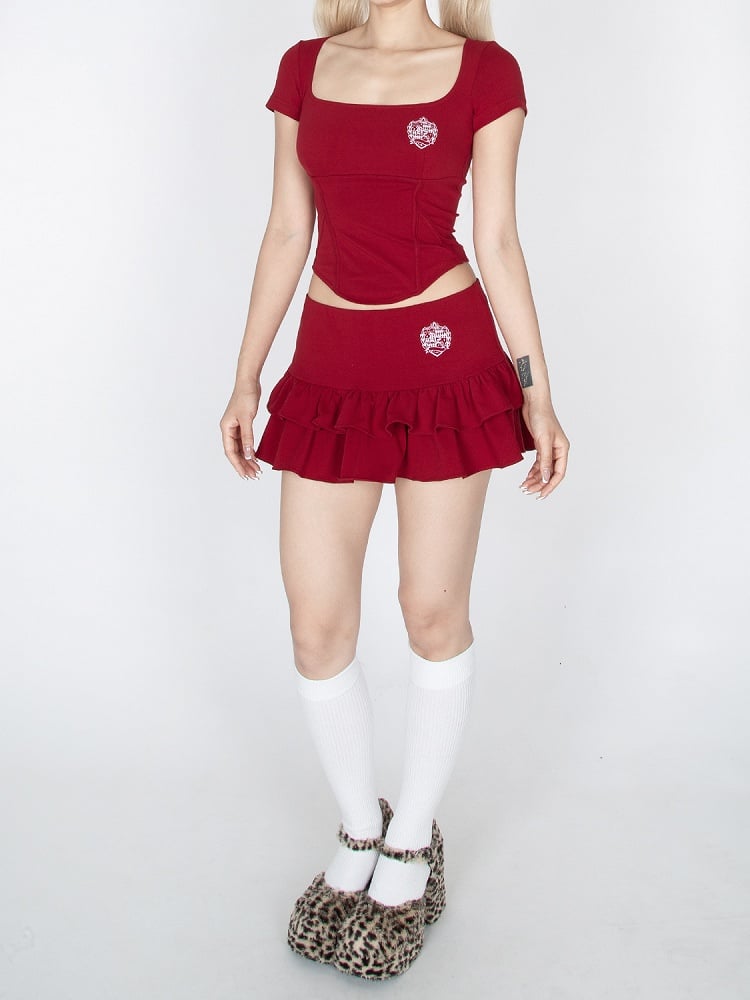 レッド/ブラック スクエアネック カーブヘム グラマラス クロップドTシャツ