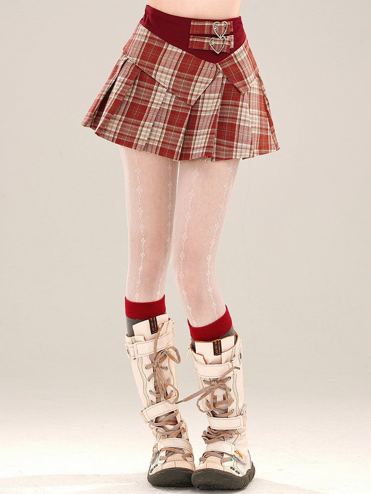レッド/ブルーバックルストラップハイウエストチェック柄プリーツミニスカート