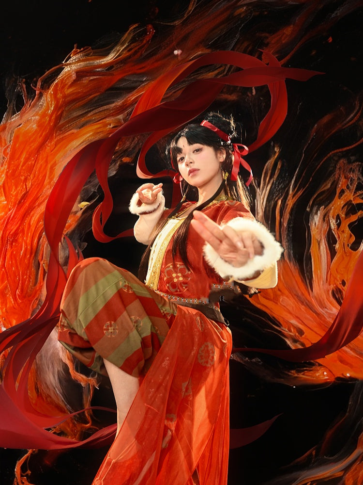 オーバーレイ付き赤いチャイナドレス風花柄ルーズパンツ